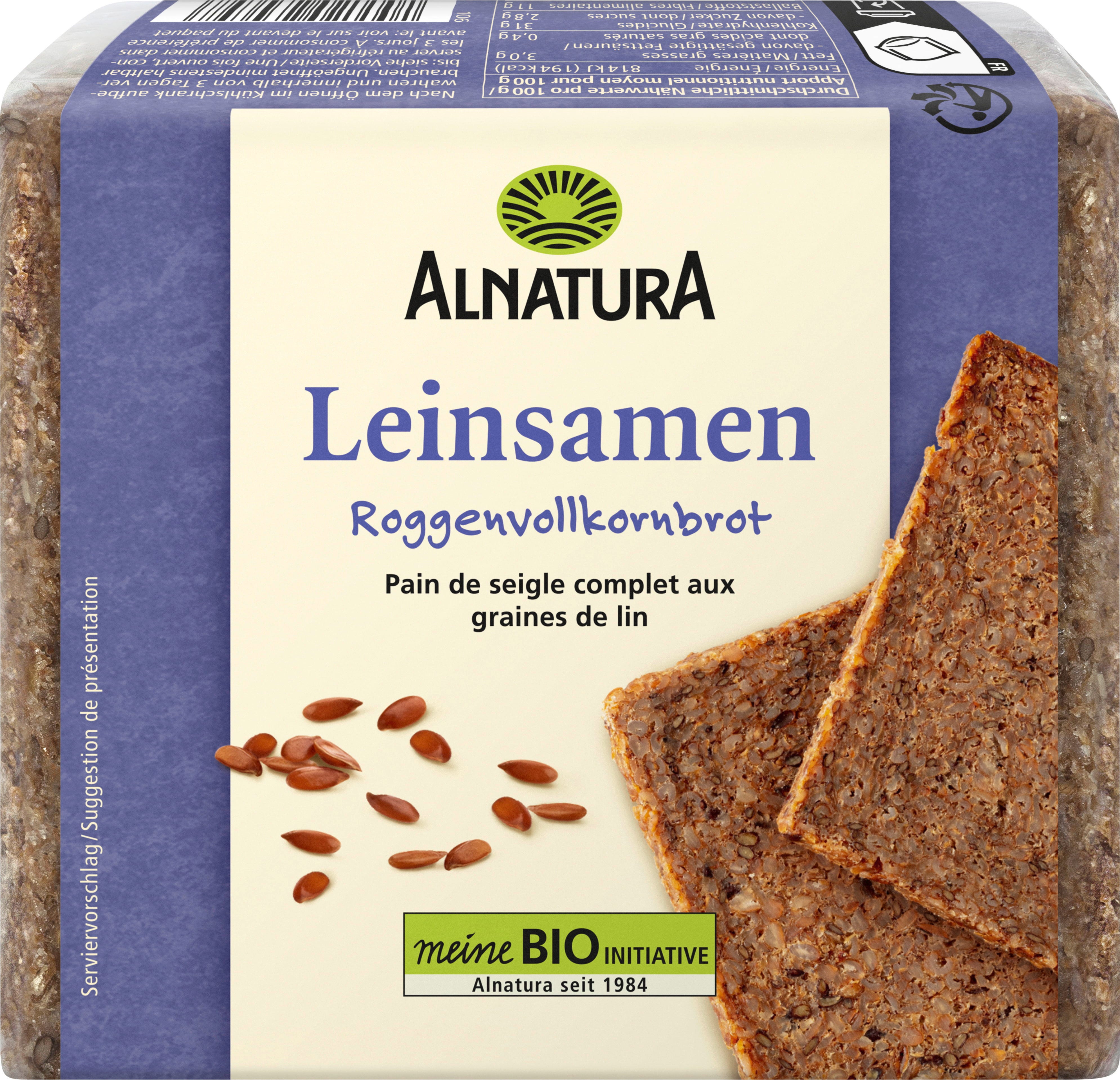 Chleb lniany Alnatura jest wytwarzany z pełnoziarnistej mąki żytniej i siemienia lnianego. Dzięki swojemu słonemu, orzechowemu smakowi równie dobrze komponuje się z pikantnymi dodatkami, takimi jak pasta do smarowania lub ser, jak i z pastą owocową i miodem. Chleb jest już pokrojony, a kromki można wyjmować pojedynczo.