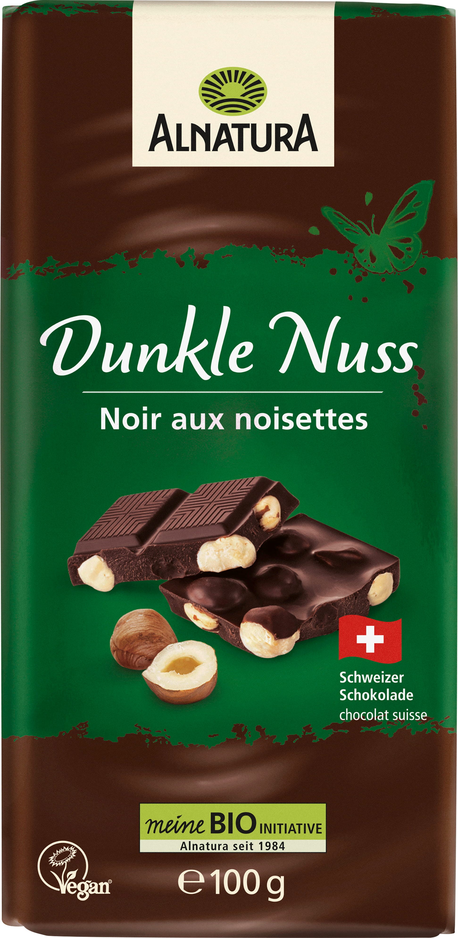 Organiczna, ciemna czekolada z orzechami marki Alnatura: ciemna czekolada z całymi orzechami laskowymi, charakteryzująca się wyjątkowo chrupiącą konsystencją. Zawartość 60% kakao zostaje dopełniona całymi orzechami laskowymi. Wyprodukowana według wegańskiej receptury bez dodatku lecytyny. Wszystkie składniki pochodzą z rolnictwa organicznego.