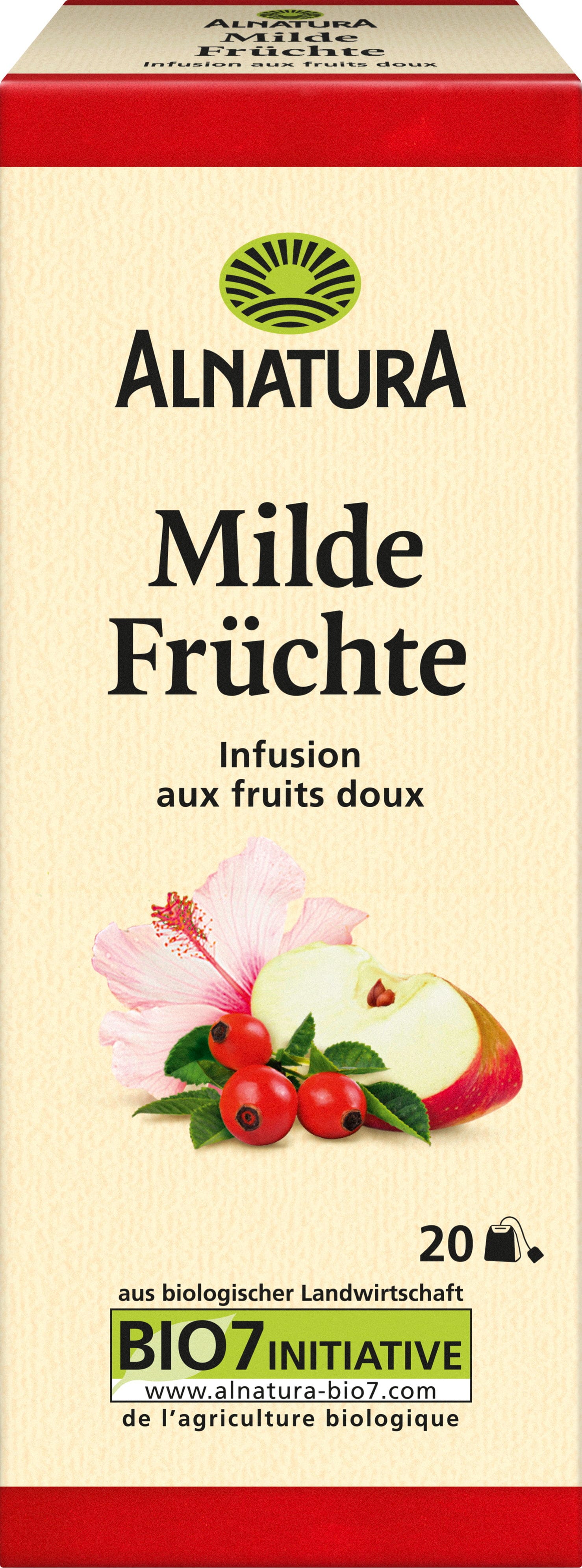 Bio delikatna herbata owocowa Alnatura to absolutna rozkosz na każdą okazję. Harmonijne połączenie jabłka i dzikiej róży, dopełnione miodokrzewem, hibiskusem i lukrecją, ma owocowy i łagodny smak i można ją pić zarówno na ciepło, jak i na zimno. Składniki pochodzą z upraw ekologicznych.