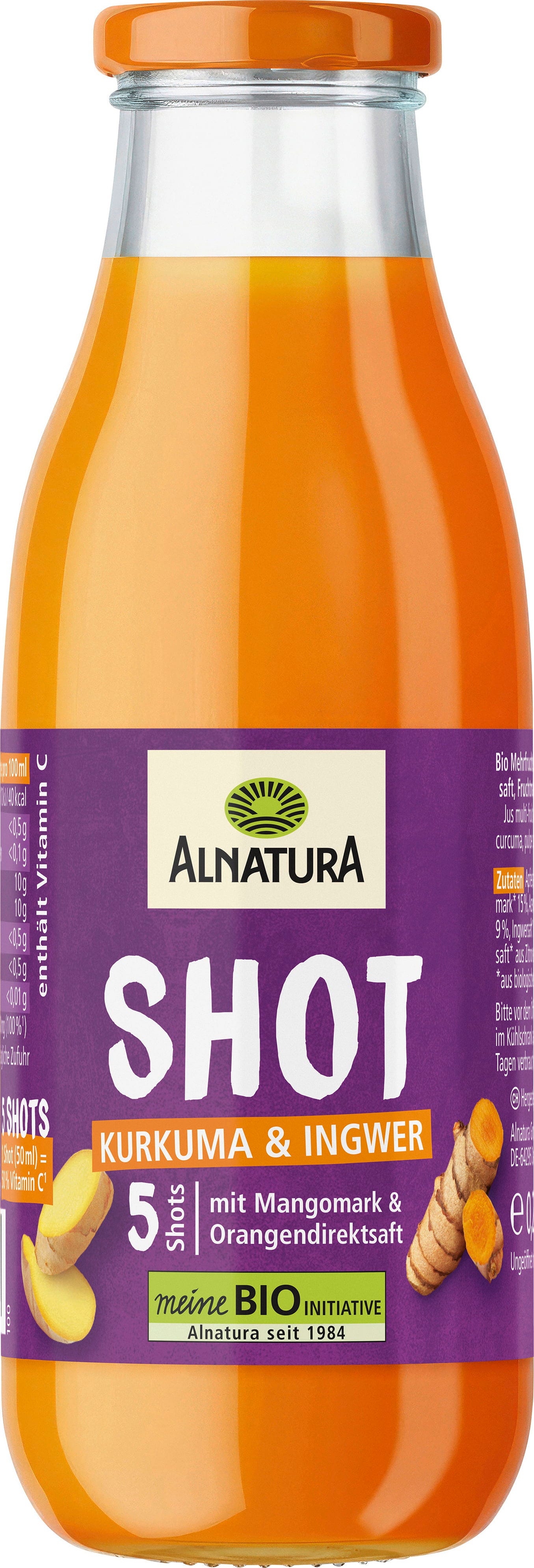 Szukasz szybkiego zastrzyku energii na dobry początek dnia lub orzeźwiającego zastrzyku energii? Organiczny shot z kurkumą Alnatura łączy w sobie pikantny imbir z ziemistym, subtelnie gorzkim sokiem z kurkumy i owocową słodyczą. Doprawiony puree z mango, czystym sokiem pomarańczowym i innymi sokami owocowymi, ten shot to idealny dodatek do codziennych posiłków.