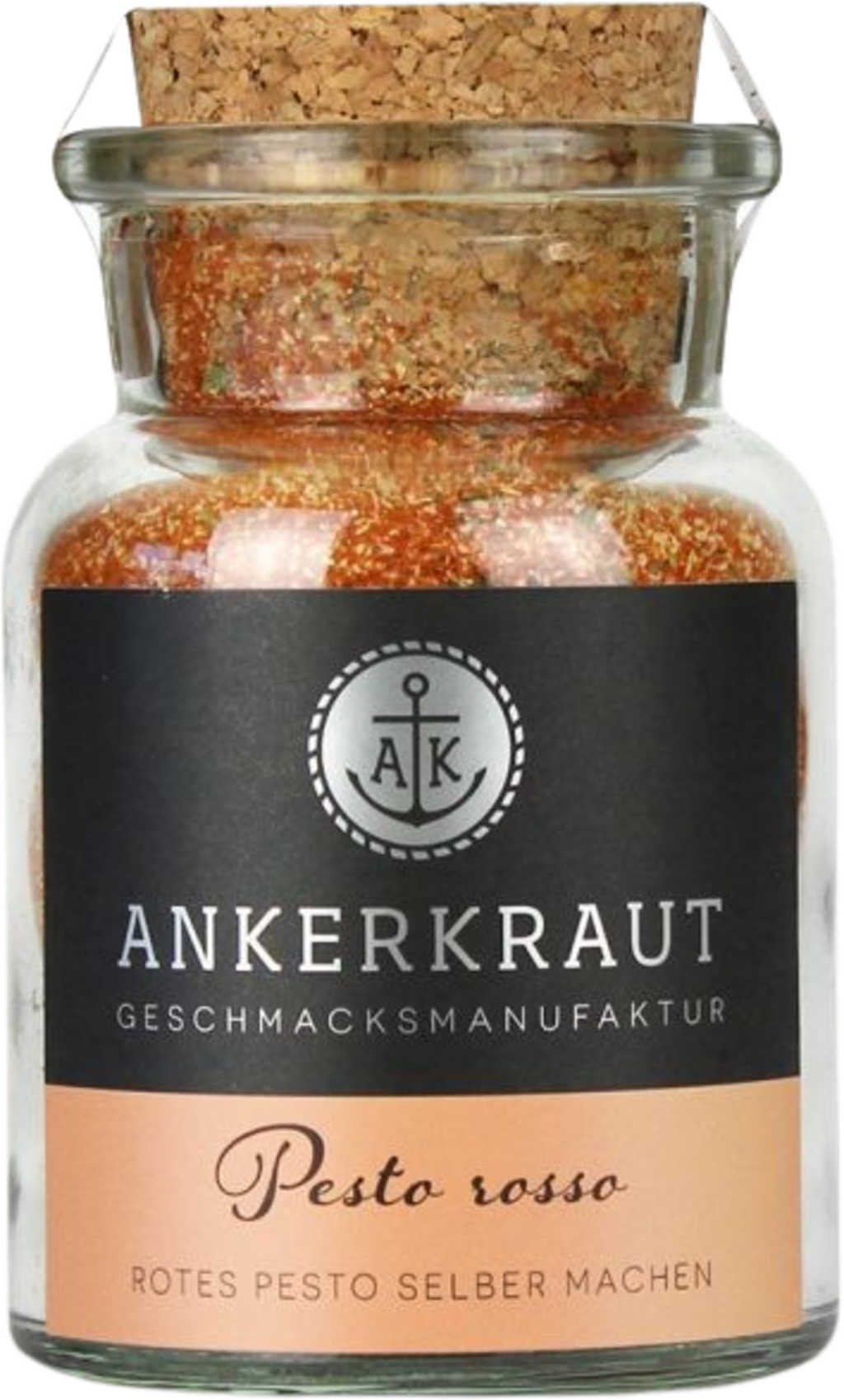 Szybkie danie: makaron i pesto. Dzięki tej wspaniałej mieszance możesz łatwo wyczarować czerwone pesto. Połączenie orzeszków piniowych, czosnku, soli morskiej, proszku pomidorowego, wędzonej papryki, słodkiej papryki i majeranku będzie pasować do Twojego makaronu. Daj go parmezan i ciesz się smakiem!