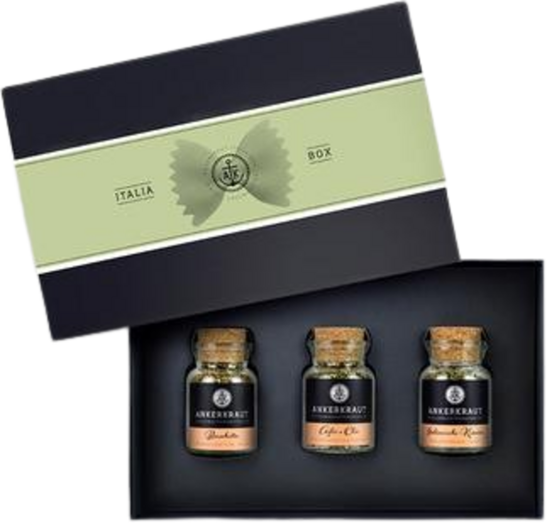 Zestaw podarunkowy "Italia Selection" zawiera 3 mieszanki ziół i przypraw idealnie nadających się do potrwa kuchni śródziemnomorskiej. Każda zapakowana w słoiczek zamykany korkiem, a całość w eleganckim, czarnym opakowaniu z oryginalną banderolą marki Ankerkraut.