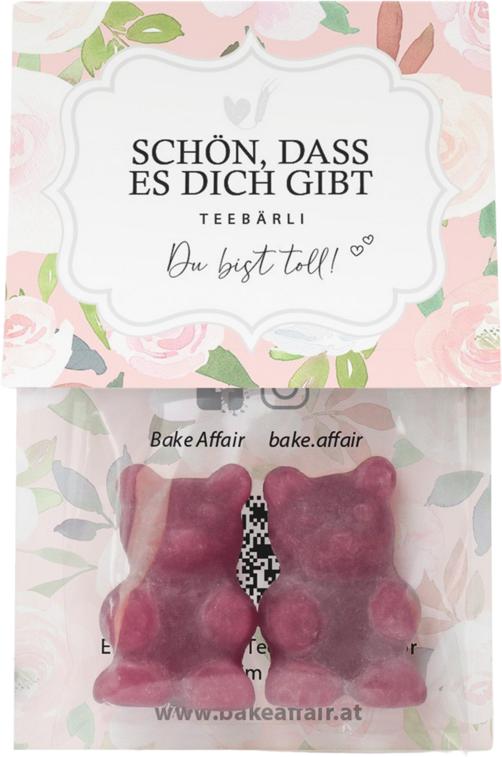 Powiedz swoim bliskim, jak bardzo ich kochasz. Dzięki herbacianym niedźwiadkom "Cieszę się, że jesteś" od Bake Affair możesz przekazać pełną miłości wiadomość. Na opakowaniu znajduje się również napis "Jesteś wspaniały". Gwarantujemy, że wywołają uśmiech na twarzy Twoich bliskich. Misie nadają się do rozpuszczenia w gorącej wodzie lub oczywiście można je zjeść od razu.
