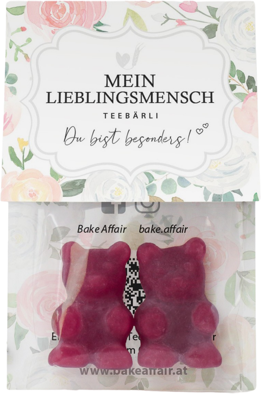 Osłódź codzienność swojej ulubionej osoby. Dzięki niedźwiadkom herbaty "Moja ulubiona osoba" od Bake Affair możesz sprawić radość swoim bliskim. Herbaciane niedźwiadki o smaku czarnego bzu i rabarbaru wystarczą na 1-2 gorące napoje lub można je po prostu zjeść od razu. Na opakowaniu znajduje się również napis "Jesteś kimś wyjątkowym".