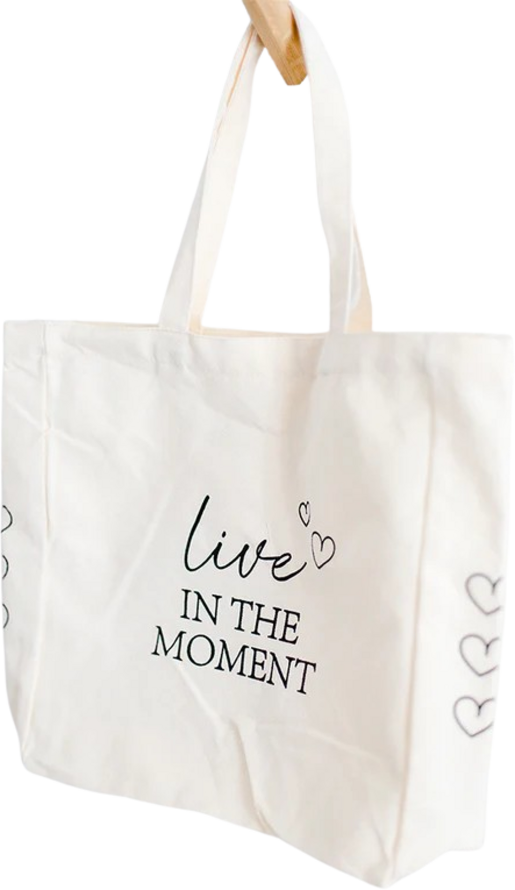 Ta solidna i pięknie zadrukowana bawełniana torba z długimi uchwytami i napisem "Live in the moment" będzie Ci towarzyszyć, gdziekolwiek się udasz. Bez wysiłku pomieści butelkę wody, zakupy, sprzęt sportowy lub cokolwiek innego, co lubisz ze sobą zabierać.