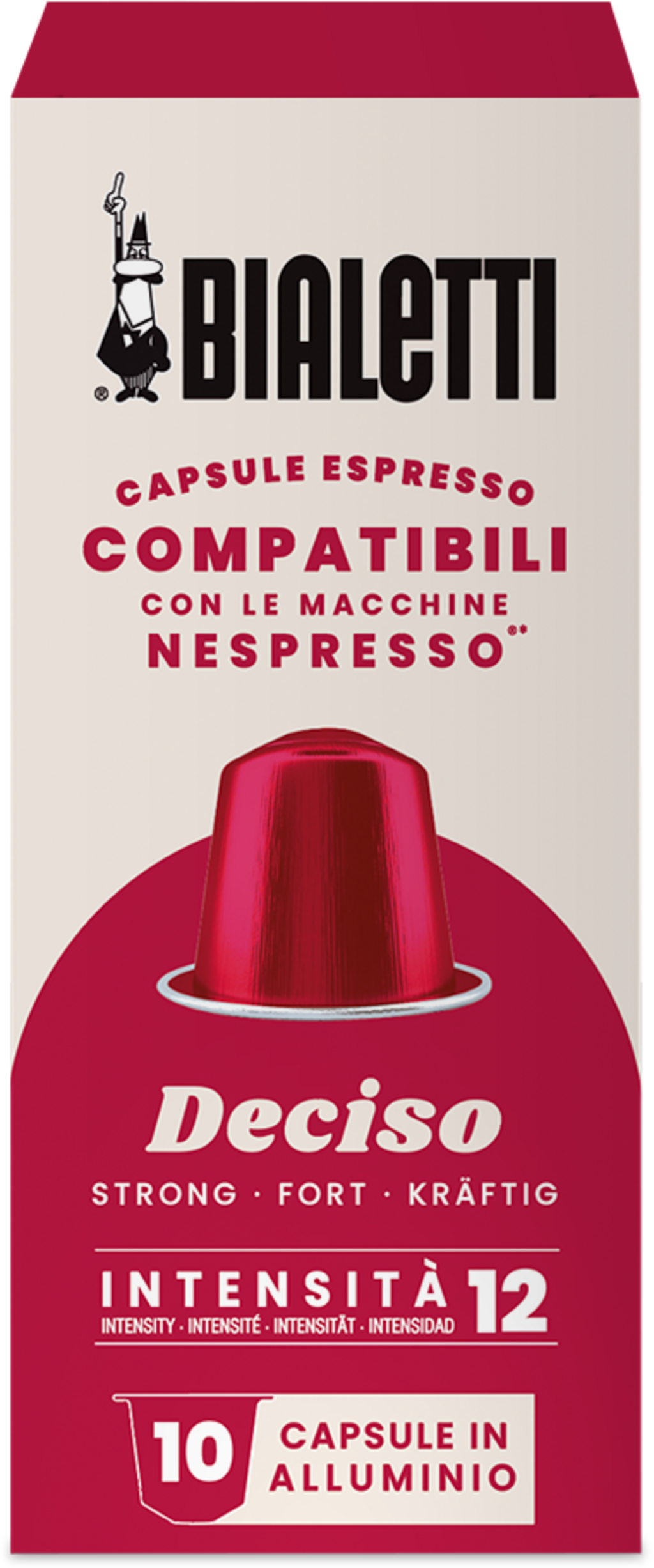 Kawa w kapsułkach Bialetti Deciso to w 100% z Robusty i oferuje intensywne doznania smakowe pełne bogatych aromatów. Ciemne palenie doskonale podkreśla nuty palonej kawy i czekolady, a długotrwały posmak przypraw i suszonych owoców rozpieszcza podniebienie. Dla wszystkich, którzy kochają mocne i aromatyczne espresso.