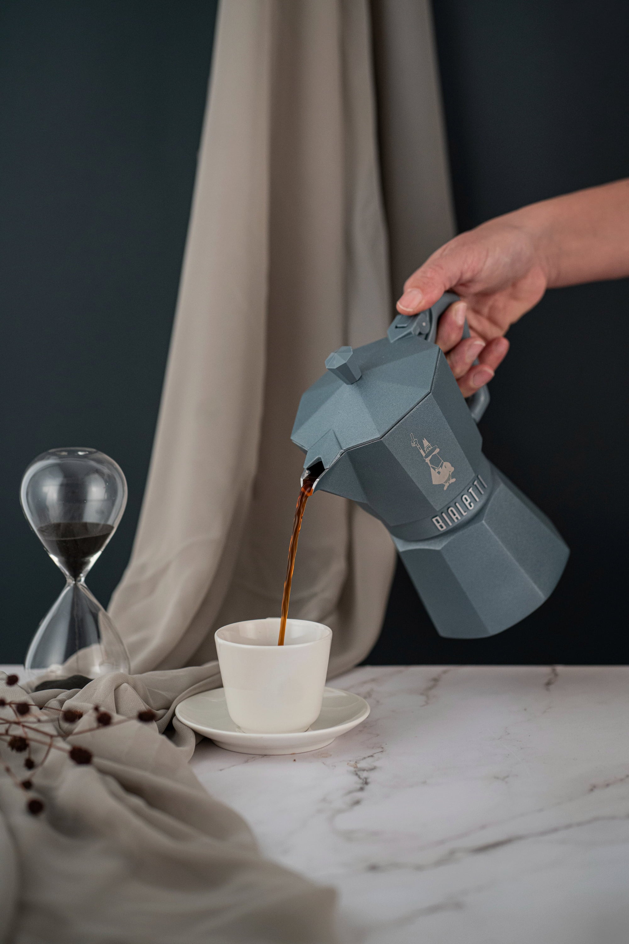 Ten dzbanek to reedycja kultowej kawiarki z lat 60. XX wieku. Dzięki swoim kształtom w stylu vintage, kultowemu ośmiokątnemu kształtowi i diamentowemu pokrętłu, wnosi on klimat retro do każdej kuchni. Nowy uchwyt spełnia współczesne wymagania ergonomiczne i techniczne, a klasyczny szary kolor jest jednocześnie stonowany i ponadczasowy. Nadaje się również do wszystkich kuchenek, w tym indukcyjnych.