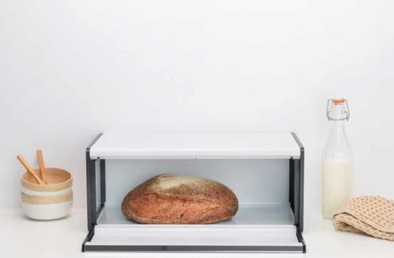 Praktyczny przechowywanie świeżego pieczywa: pojemnik na pieczywo na zawiasach z opuszczanym frontem łączy elegancki wygląd z praktyczną funkcjonalnością. Dzięki magnetycznemu zatrzaskowi wszystko pozostaje niezawodnie zamknięte, a wgłębiona podstawa zapewnia optymalną cyrkulację powietrza. Płaski blat zapewnia dodatkową przestrzeń do przechowywania - można też powiesić pojemnik na ścianie, aby zaoszczędzić miejsce.