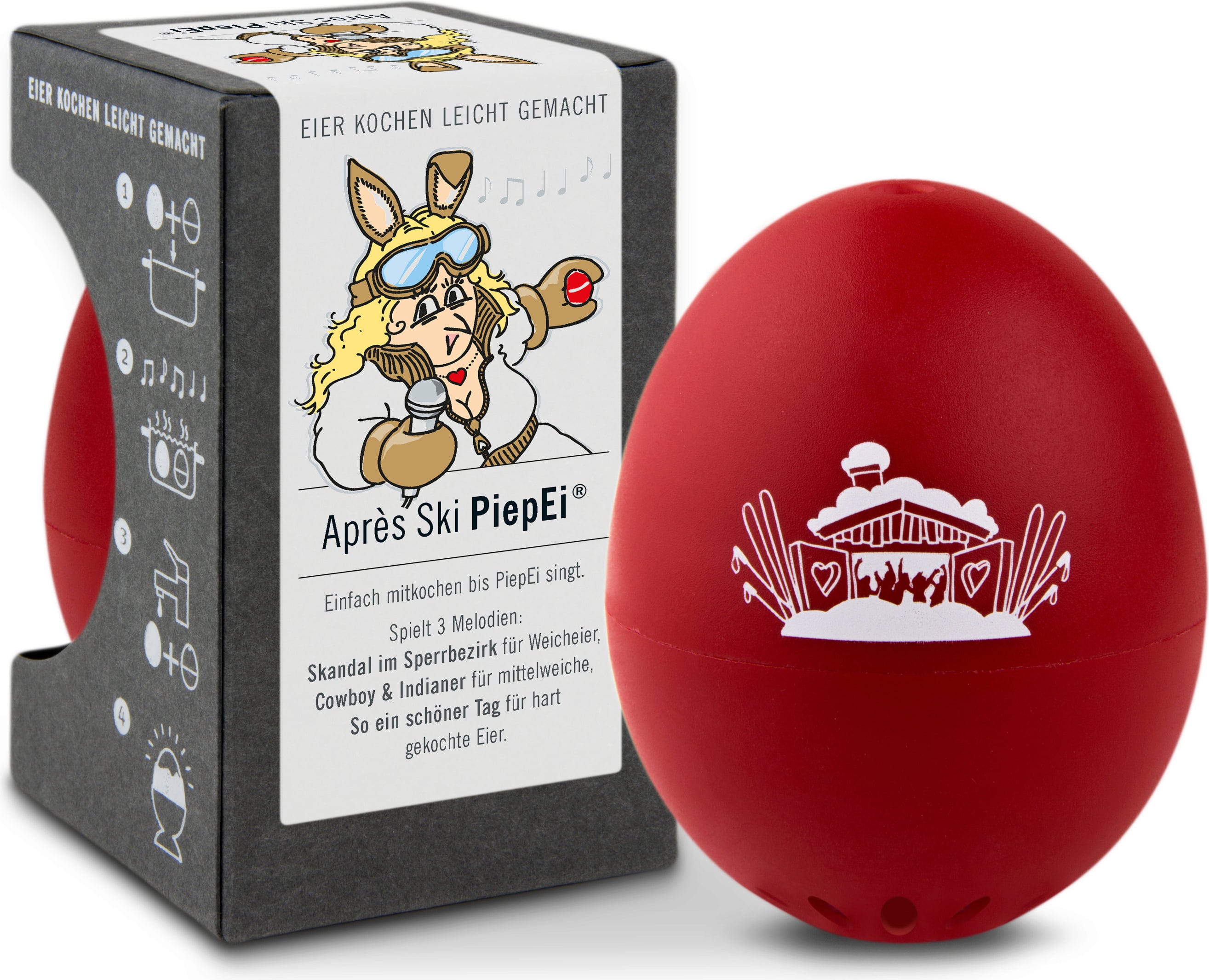 Wystarczy przechowywać Après Ski PiepEi razem z jajkami, gotować je wspólnie i poczekać, aż zabrzmi melodia odpowiadająca wybranemu stopniowi ugotowania. Niezależnie od temperatury początkowej wody, wielkości jajek czy wysokości nad poziomem morza.