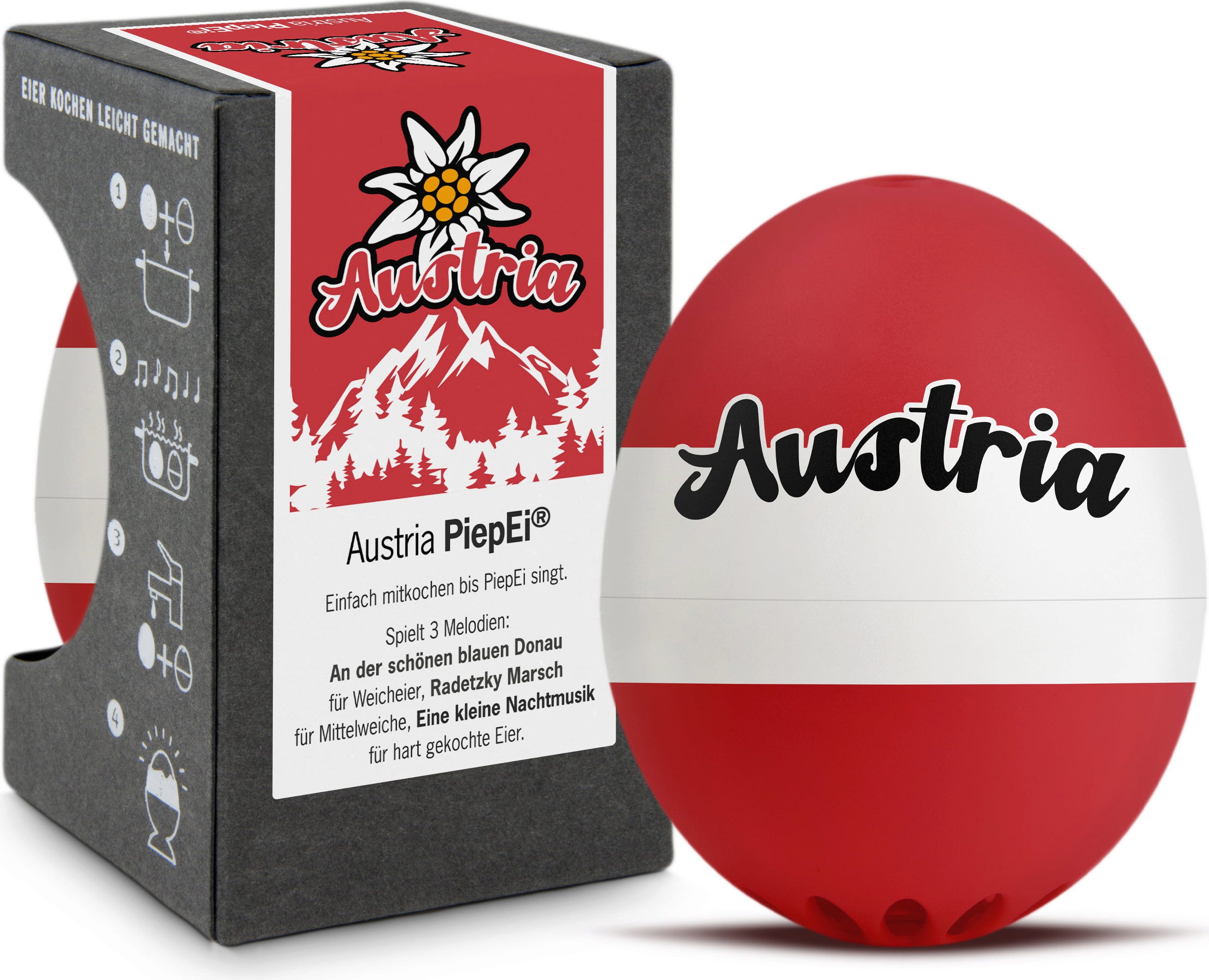 Wystarczy przechowywać Austria PiepEi razem z jajkami, gotować je wspólnie i poczekać, aż zabrzmi melodia odpowiadająca wybranemu stopniowi ugotowania. Niezależnie od temperatury początkowej wody, wielkości jajek czy wysokości nad poziomem morza.