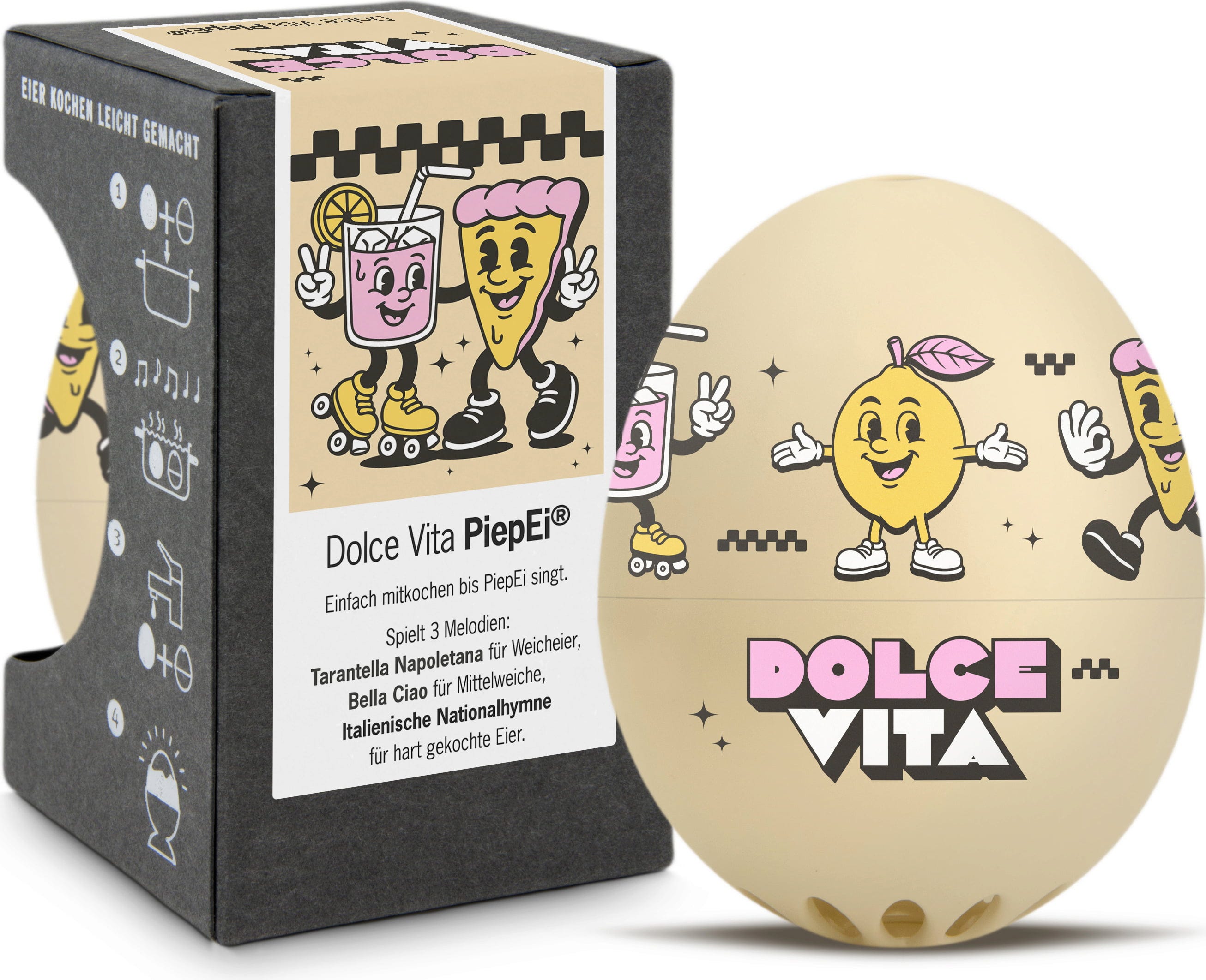 Wystarczy przechowywać Dolce Vita PiepEi razem z jajkami, gotować je wspólnie i poczekać, aż zabrzmi melodia odpowiadająca wybranemu stopniowi ugotowania. Niezależnie od temperatury początkowej wody, wielkości jajek czy wysokości nad poziomem morza.