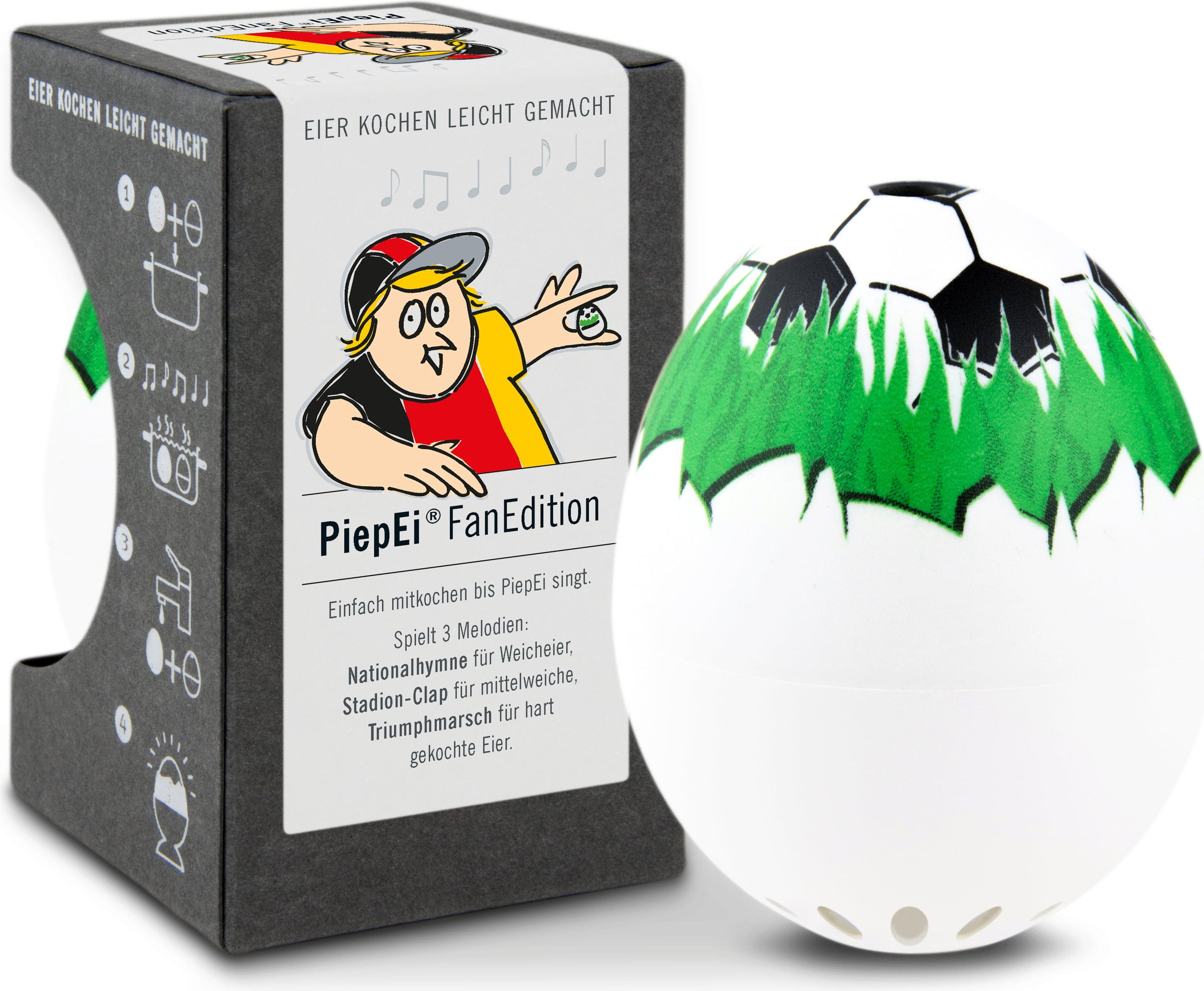 Wystarczy przechowywać FanEdition PiepEi razem z jajkami, gotować je wspólnie i poczekać, aż zabrzmi melodia odpowiadająca wybranemu stopniowi ugotowania. Niezależnie od temperatury początkowej wody, wielkości jajek czy wysokości nad poziomem morza.