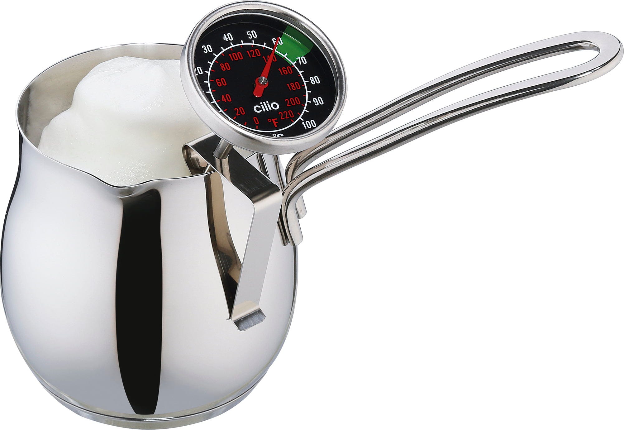 Dzięki termometrowi do mleka cilio wykonanemu z wysokiej jakości stali nierdzewnej można niezawodnie zapobiegać przegrzaniu mleka, co zrujnowałoby jego smak i konsystencję. Długa igła pomiarowa reaguje szybko i precyzyjnie, dzięki czemu można zatrzymać proces spieniania mleka dokładnie w odpowiednim momencie. Elastyczny klips mocujący idealnie dopasowuje się do różnych wysokości dzbanka.