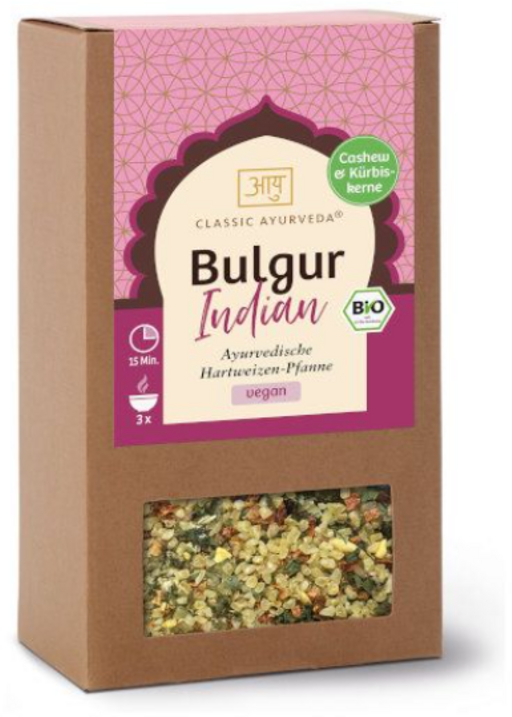 Bulgur indyjski to oszczędzający czas sposób na przygotowanie pełnowartościowego posiłku na bazie delikatnie gotowanej na parze organicznej pszenicy durum. Przepis łączy chrupiące orzechy nerkowca i pestki dyni z suszoną marchewką, papryką i płatkami pomidorów. Delikatnie wyważona mieszanka liści kolendry, kopru włoskiego, kurkumy i kminku zapewnia orientalny smak. Produkt nadaje się jako dodatek do dań warzywnych, jako składnik sałatek lub jako baza do dań z patelni i nadzień.