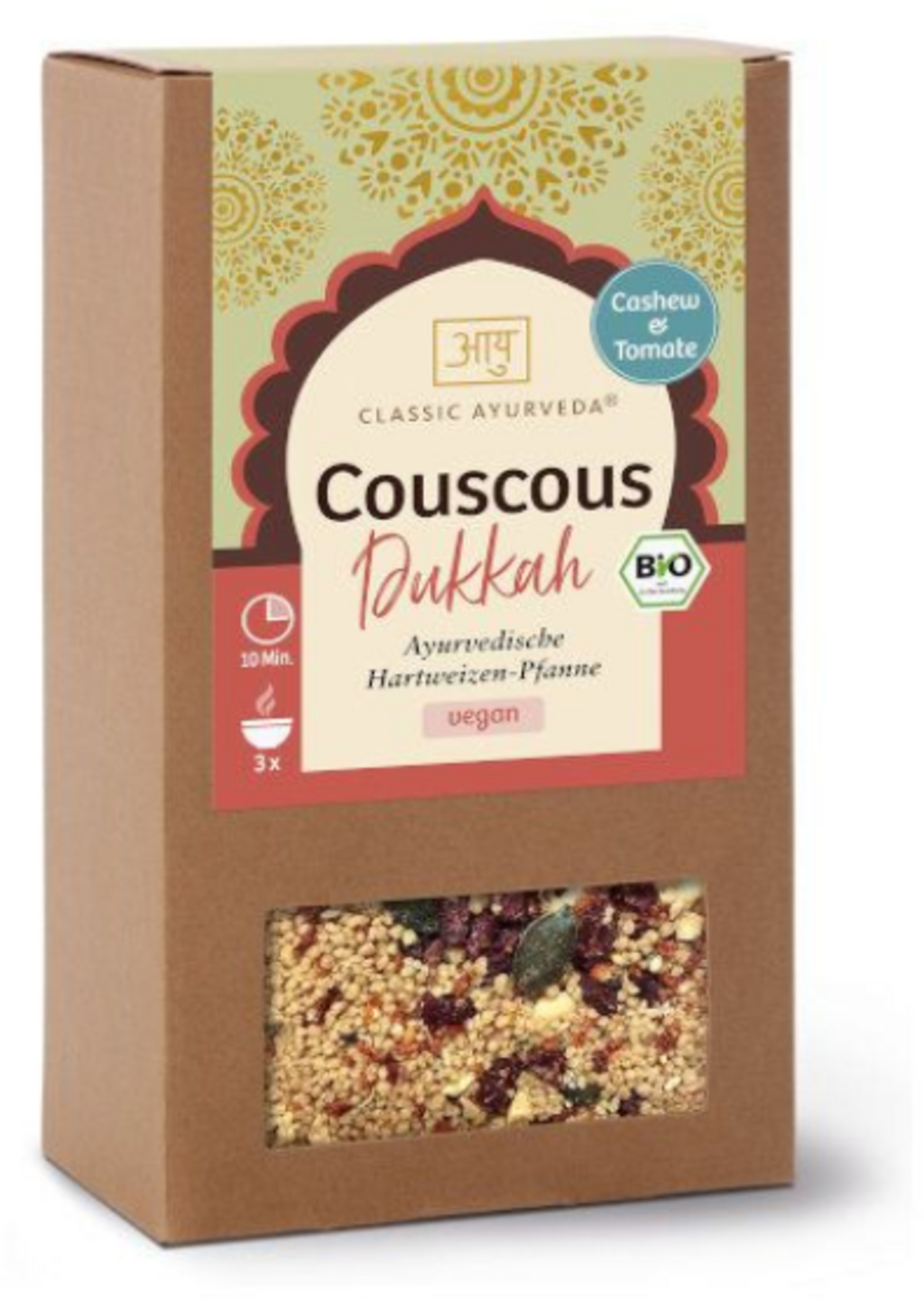Ten kuskus dukkah jest wytwarzany z pełnoziarnistej semoliny z pszenicy durum i charakteryzuje się delikatnym, łagodnym smakiem. Mieszanka łączy chrupiące orzechy nerkowca z tradycyjną orientalną mieszanką przypraw dukkah, a także płatkami pomidorów, pestkami dyni i berberysem. Inne składniki, takie jak orzechy laskowe, ciecierzyca, nasiona sezamu i skórka pomarańczowa, uzupełniają profil. Produkt nadaje się do przygotowywania posiłków i może być stosowany jako dodatek do dań z patelni lub jako baza do sałatek i nadzień.