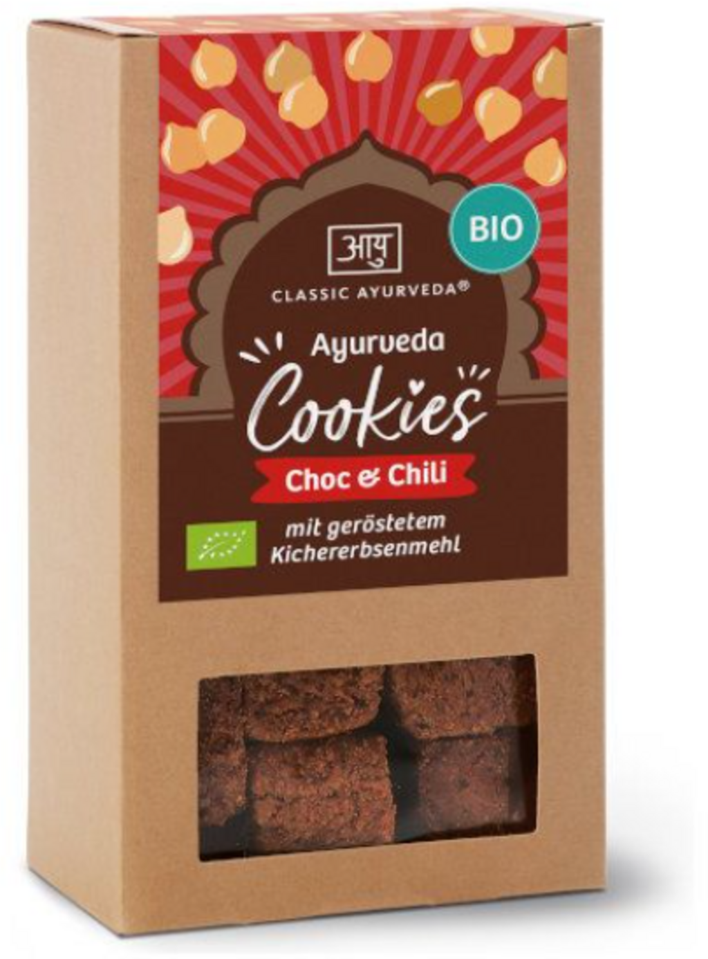 Te ciasteczka Ayurveda są oparte na tradycyjnej recepturze i są wykonane z delikatnie prażonej mąki z ciecierzycy. Kompozycja łączy w sobie kakao w proszku i śruty kakaowe z subtelną nutą chili, płatkami pomarańczy i skórką pomarańczową. Organiczne ghee z certyfikowanego mleka siennego, nasiona chia i sól kamienna uzupełniają listę składników, a cukier z kwiatu kokosa zapewnia naturalną słodycz. Dzięki końcowemu procesowi pieczenia ciasteczka zachowują swój kształt i stanowią odpowiednią alternatywę dla klasycznych ajurwedyjskich deserów w podróży lub jako przekąska.