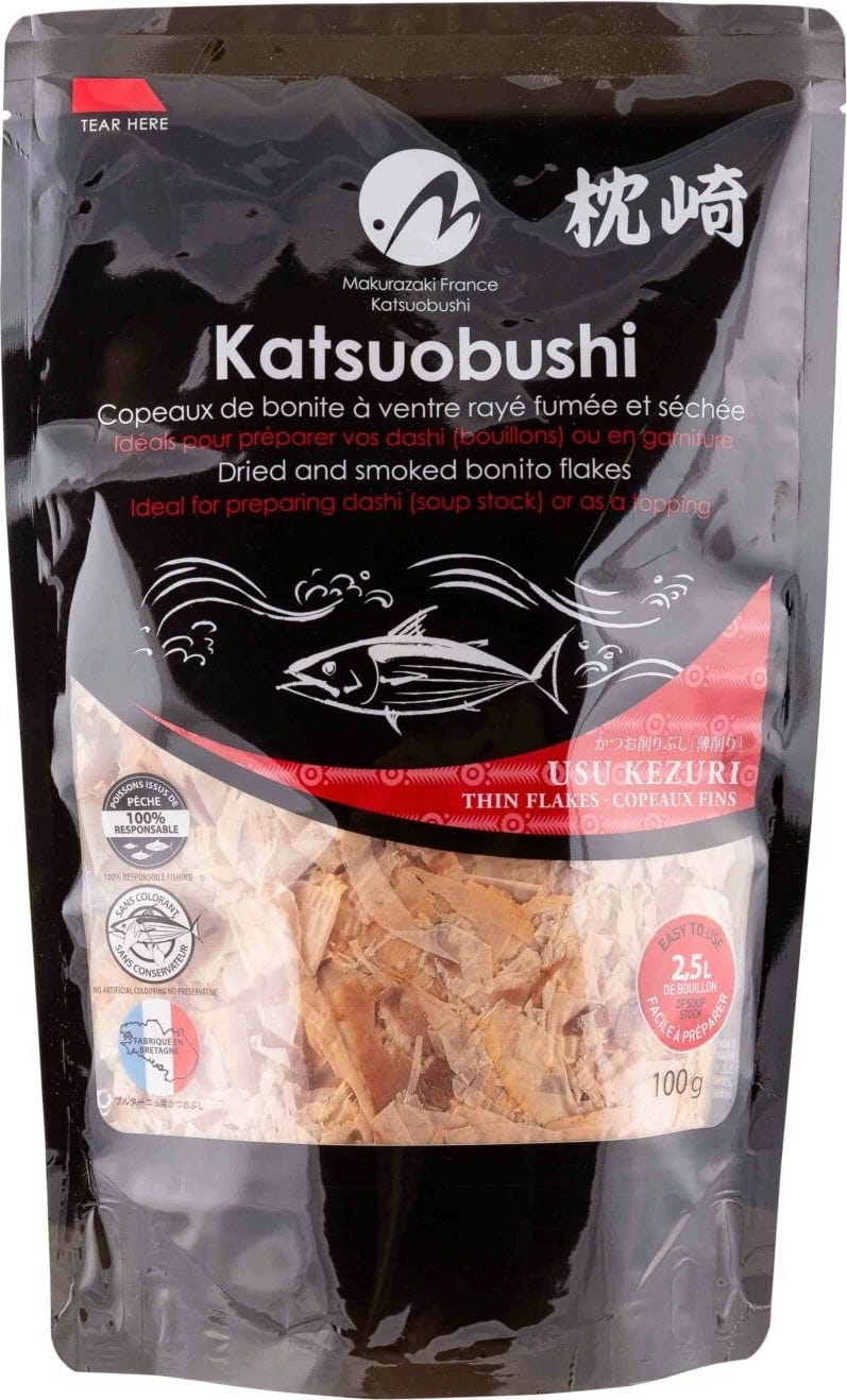 Te cienkie katsuobushi są produkowane we Francji przy użyciu tradycyjnych metod i są bogate w umami. Nadają się zarówno do klasycznych bulionów, jak i jako dodatek do takoyaki, okonomiyaki i wielu innych potraw.