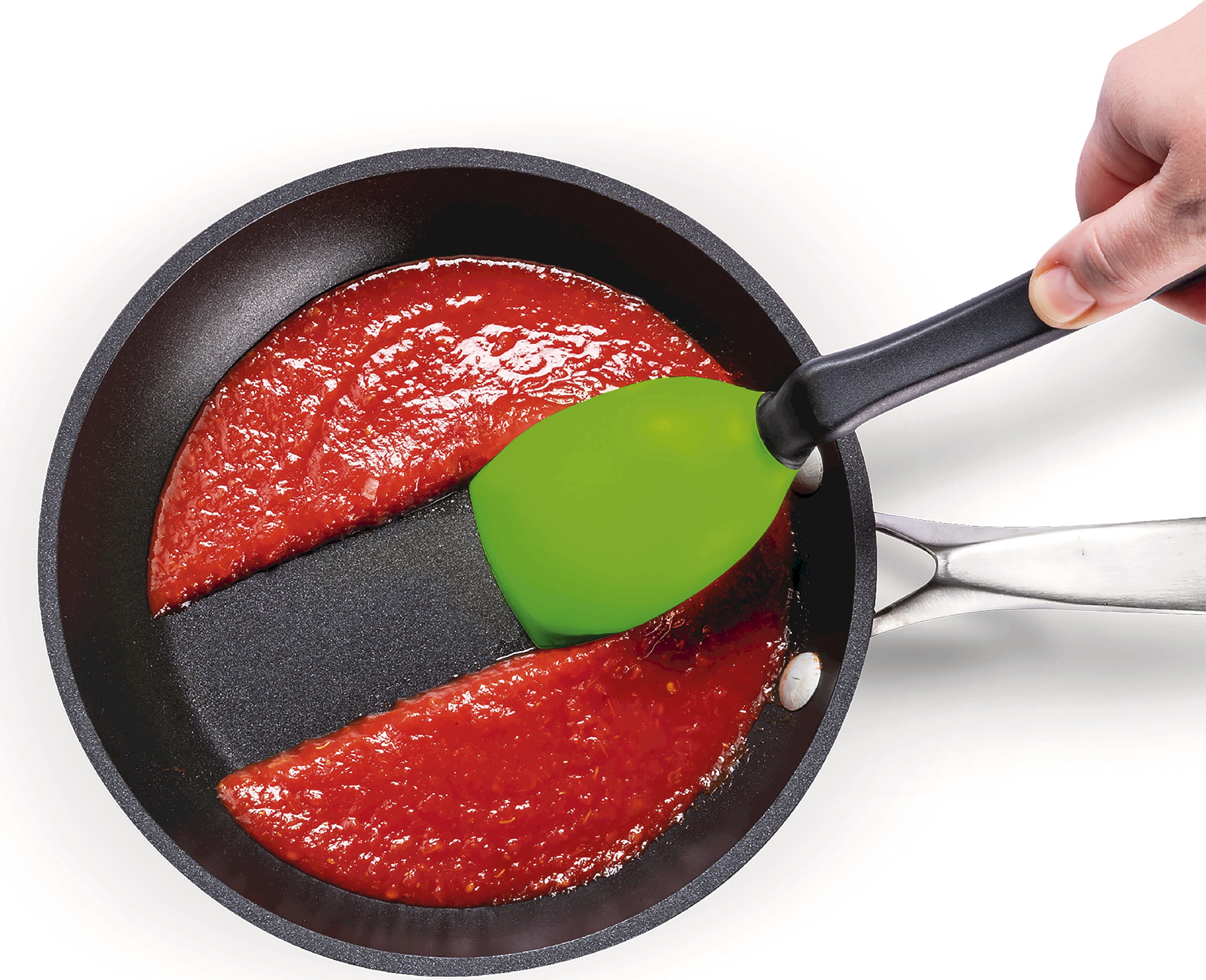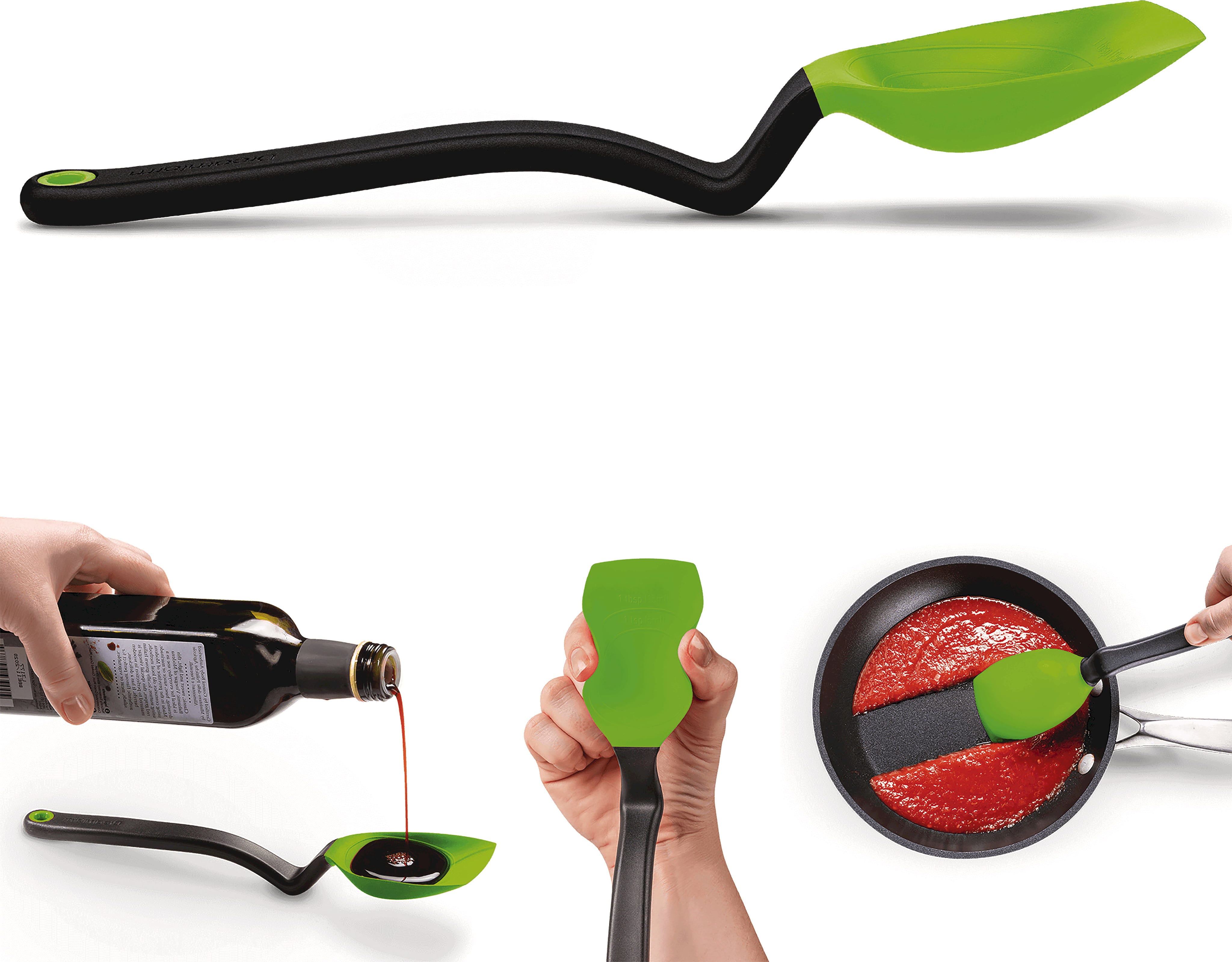 Z łyżką Supoon od Dreamfarm zyskujesz prawdziwie wielofunkcyjne narzędzie do swojej kuchni, łączące mieszanie, nabieranie, odmierzanie i skrobanie w jednym. Dzięki elastycznej silikonowej główce bez trudu dotrzesz do każdego zakamarka garnków i patelni, aby zeskrobać wszystko, co się da, a materiał niezawodnie chroni naczynia.