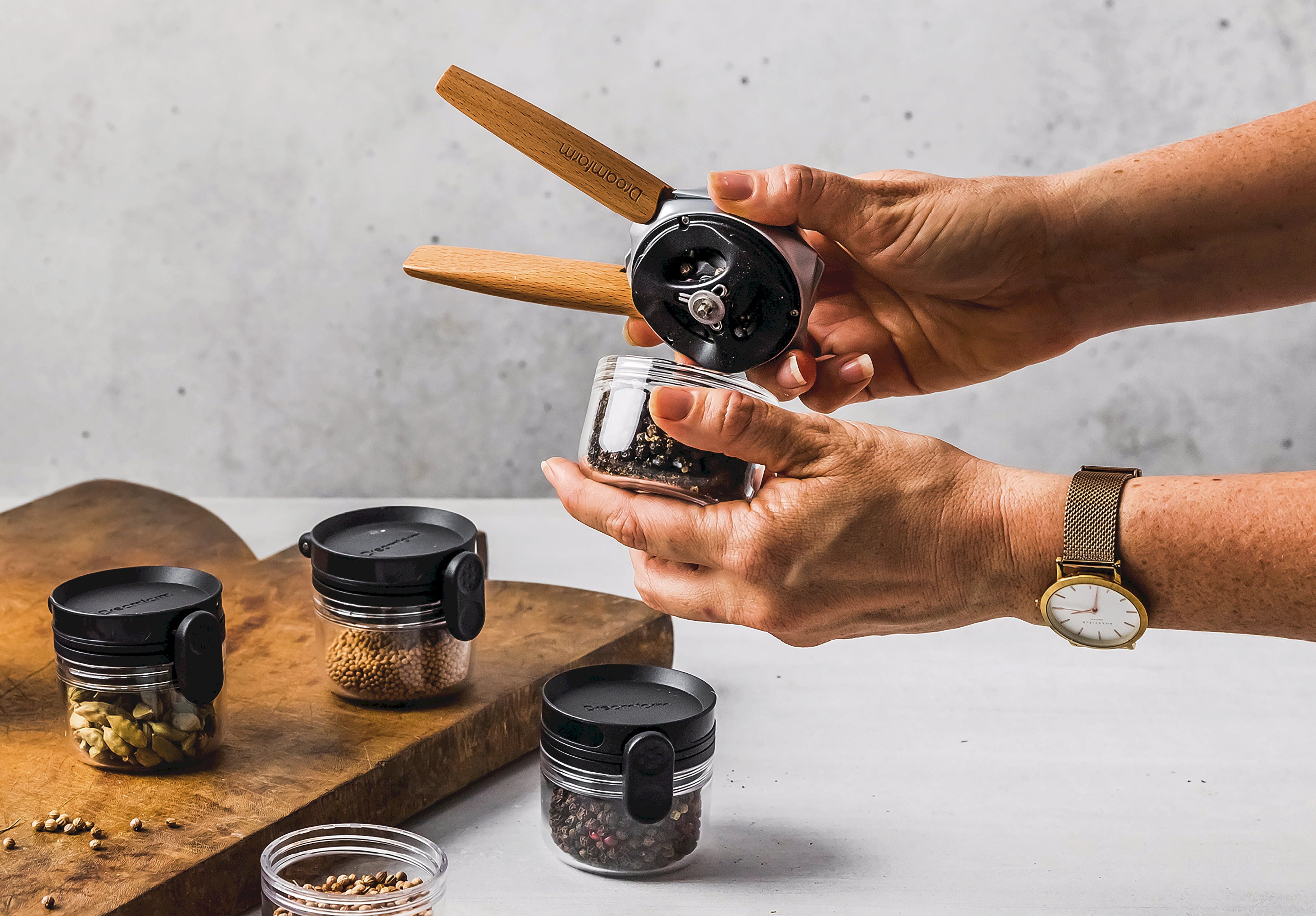 Młynek do przypraw Ortwo od Dreamfarm to pierwszy na świecie młynek do przypraw, który łączy wygodną obsługę jedną ręką z ogromną prędkością mielenia oburęcznego! Podczas gdy ściskanie uchwytów jest idealne do szybkiego przyprawiania jedną ręką, użycie dwóch rąk pozwala na szybsze mielenie większej ilości żywności.
