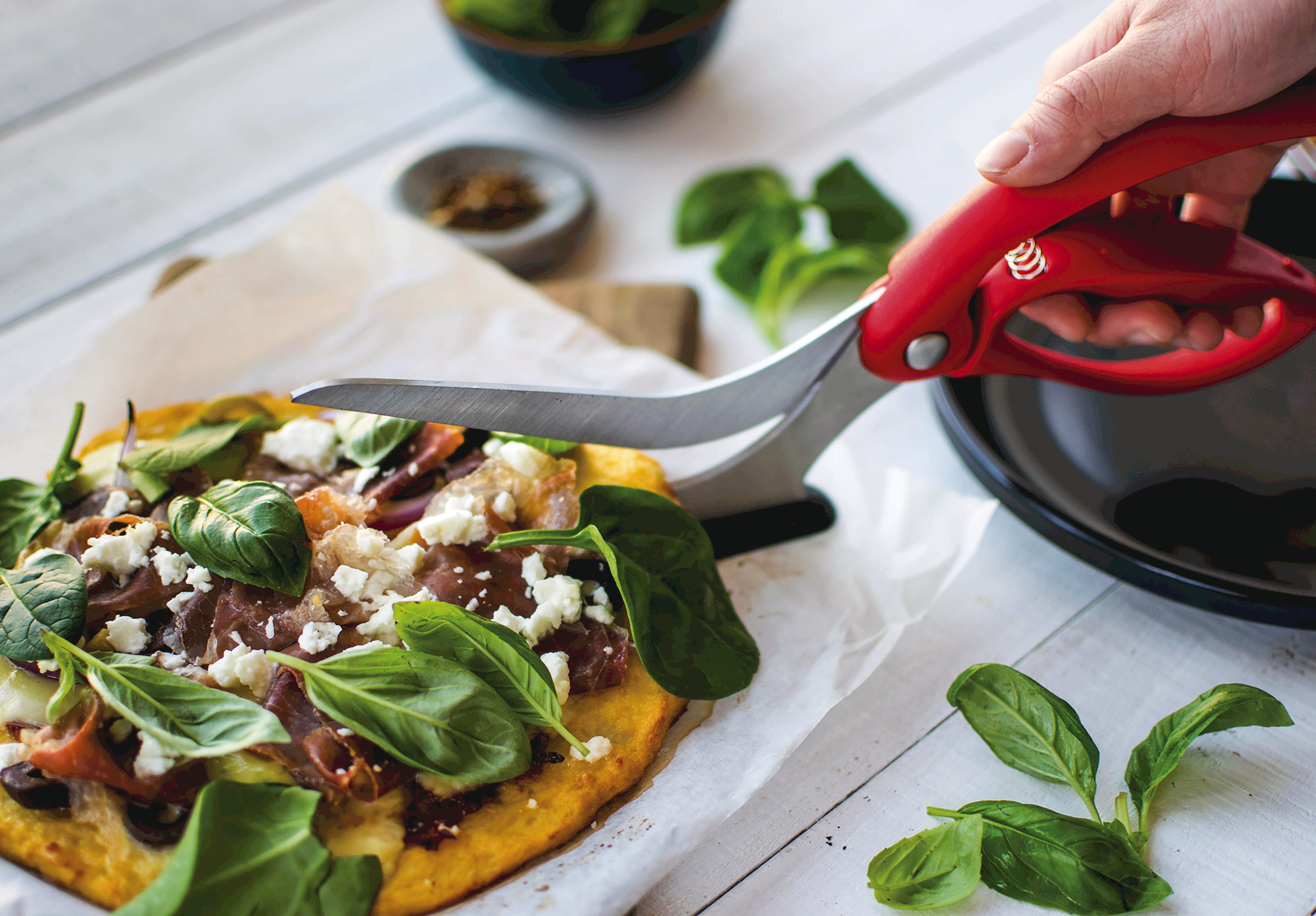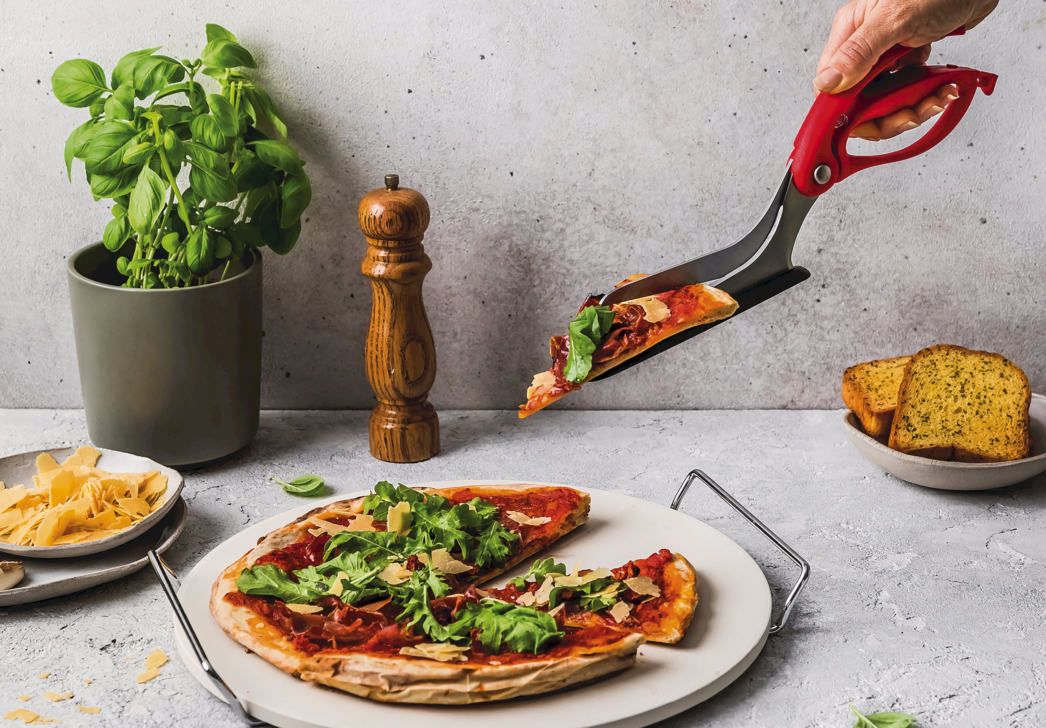 Zapomnij o tępych nożykach do pizzy, które przesuwają dodatki – z nożyczkami do pizzy Scizza od Dreamfarm bez trudu przetniesz każdy spód! Te innowacyjne nożyczki do pizzy 2 w 1 łączą w sobie hartowane ostrza z niemieckiej stali nierdzewnej, zapewniające wyjątkowo długie i precyzyjne cięcie z praktyczną funkcją serwowania.