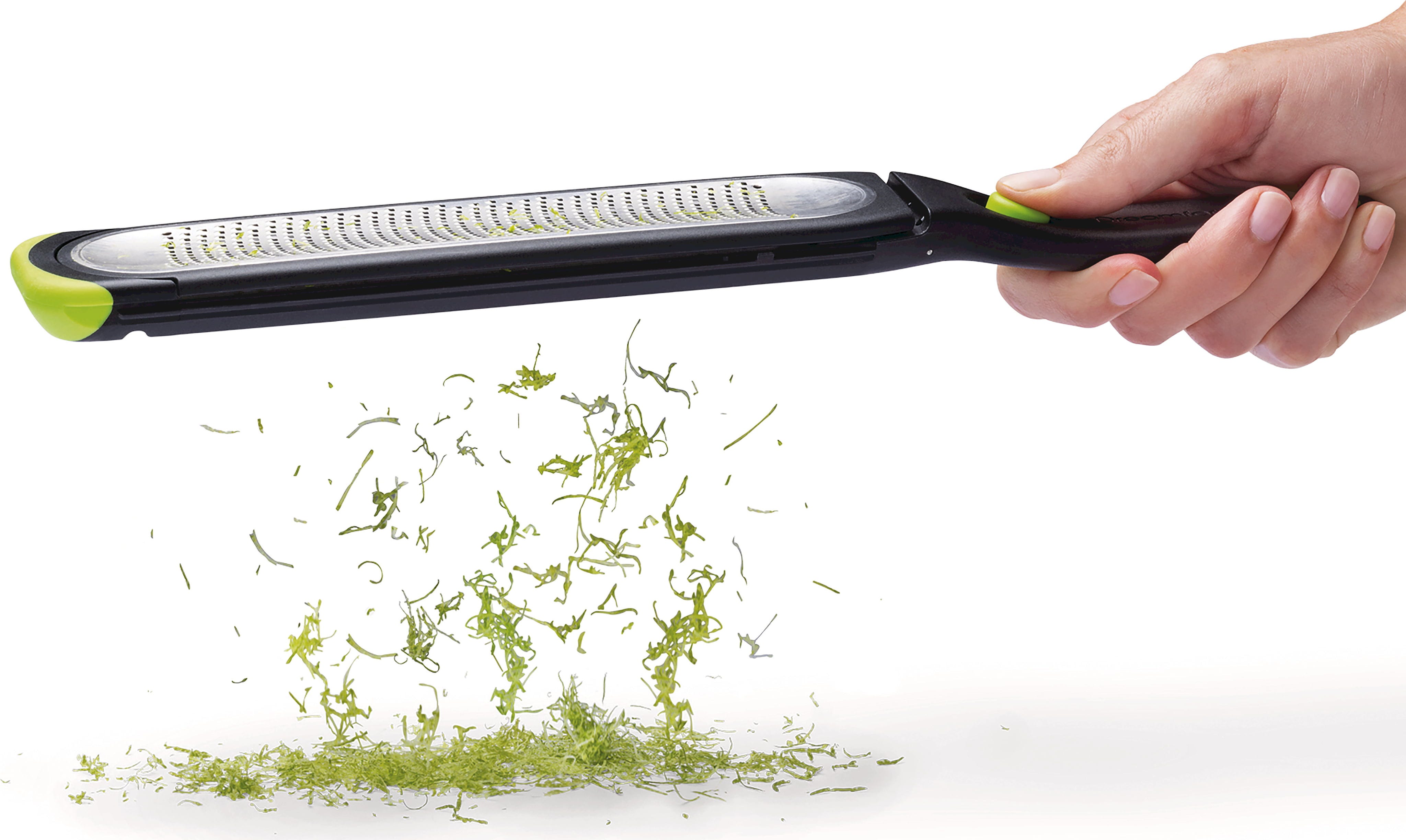 Absolutną atrakcją jest innowacyjna funkcja samooczyszczania: po naciśnięciu przycisku powierzchnia tarki wygina się tak, że cała skórka spada sama i nic nie przykleja się do krawędzi. Zawiera praktyczną osłonę do przechowywania, która może być również używana jako pojemnik do zbierania. Wykonana z wytrzymałej stali nierdzewnej tarka, którą można myć w zmywarce, to idealny wybór do precyzyjnej i wydajnej pracy w profesjonalnej kuchni!