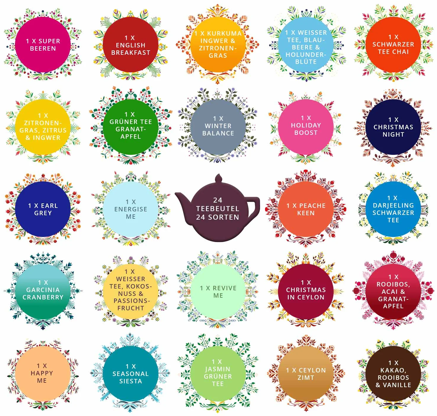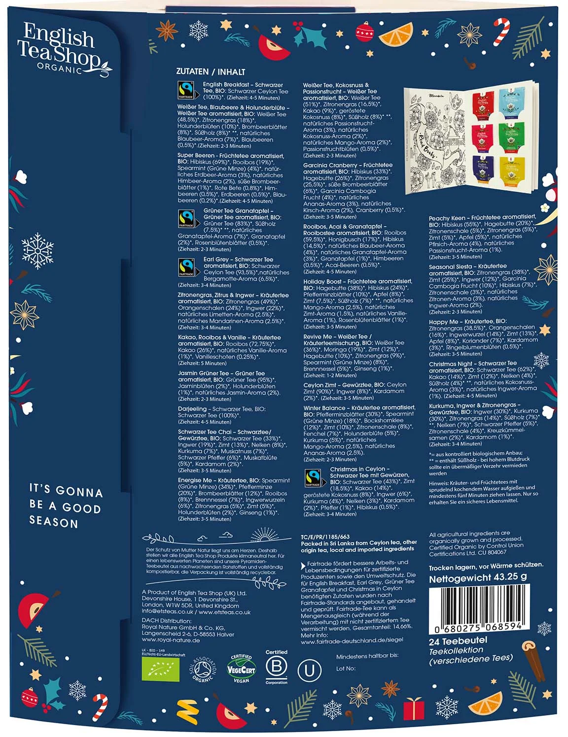 Szczególną cechą tego kalendarza adwentowego jest jego kształt, który można przeglądać jak książkę i który zawiera 24 organiczne herbaty i inne dodatki na kilku stronach. Mieszanki herbat obejmują specjalne herbaty zimowe i świąteczne, które roztaczają przedświąteczną atmosferę i zachęcają do zatrzymania się i delektowania.