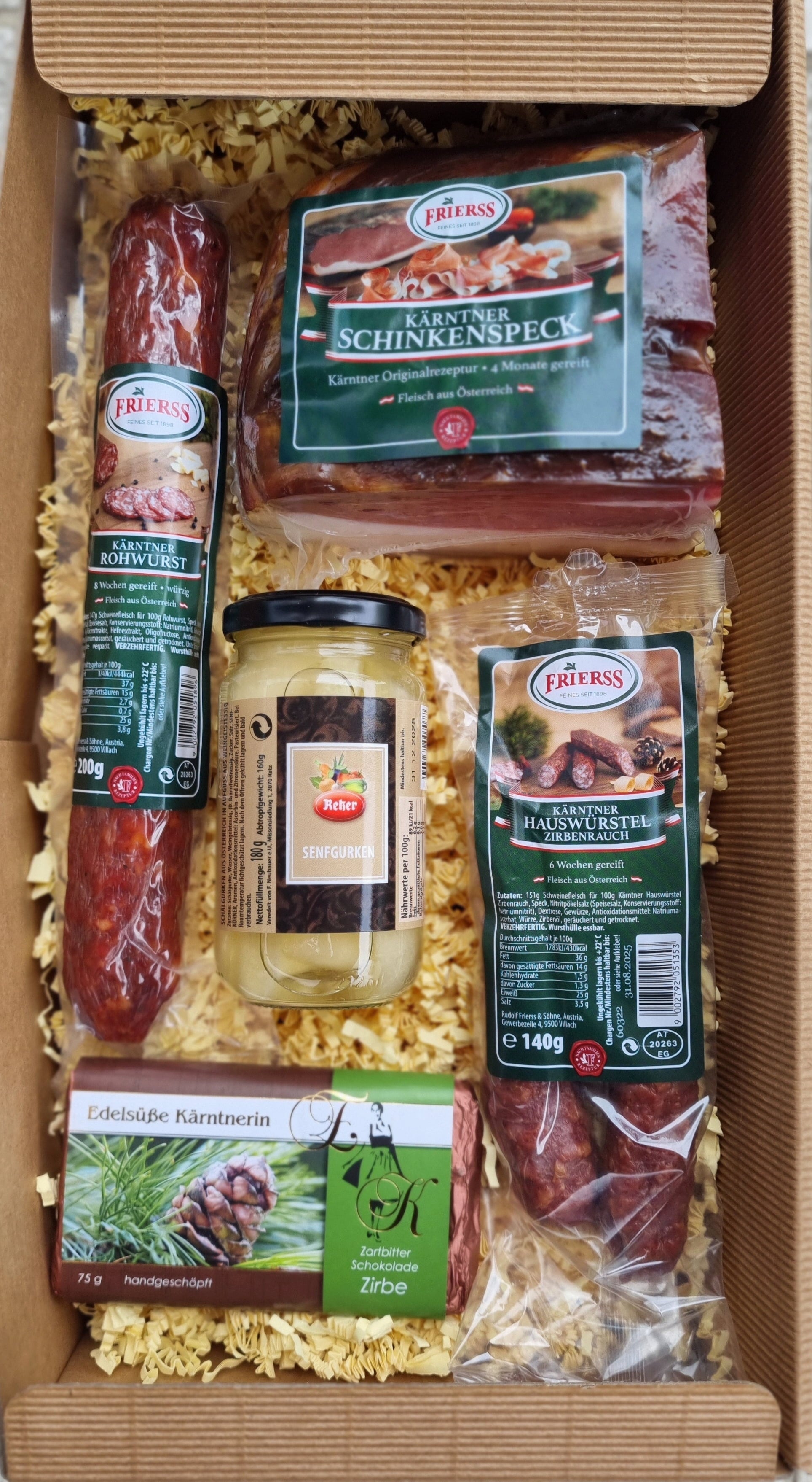Oto coś dla smakoszy wykwintnych słonych i słodkich przysmaków z Karyntii. Firma Frierss dostarcza popularną karyncką kiełbasę surową, domowe kiełbaski i boczek szynkowy na przekąskę, a ogórki Retzer stanowią kwaśny dodatek. Na koniec znajdziesz tabliczkę ręcznie robionej czekolady z szyszek limby z manufaktury czekolady Nußbaumer.