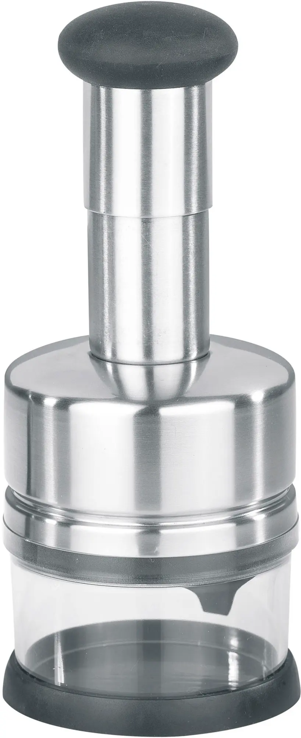 Dzięki zintegrowanemu systemowi zgarniającemu, ścinki nie przyklejają się do ścianek, ale są niezawodnie podawane z powrotem do ostrzy - zapewnia to równomierne rezultaty bez ciągłego ręcznego popychania. Dzięki antypoślizgowej podstawie siekacz jest zawsze stabilny. Pojemnik o pojemności 250 ml służy nie tylko jako taca ociekowa, ale może być również używany bezpośrednio do przechowywania w lodówce dzięki dołączonej pokrywie.