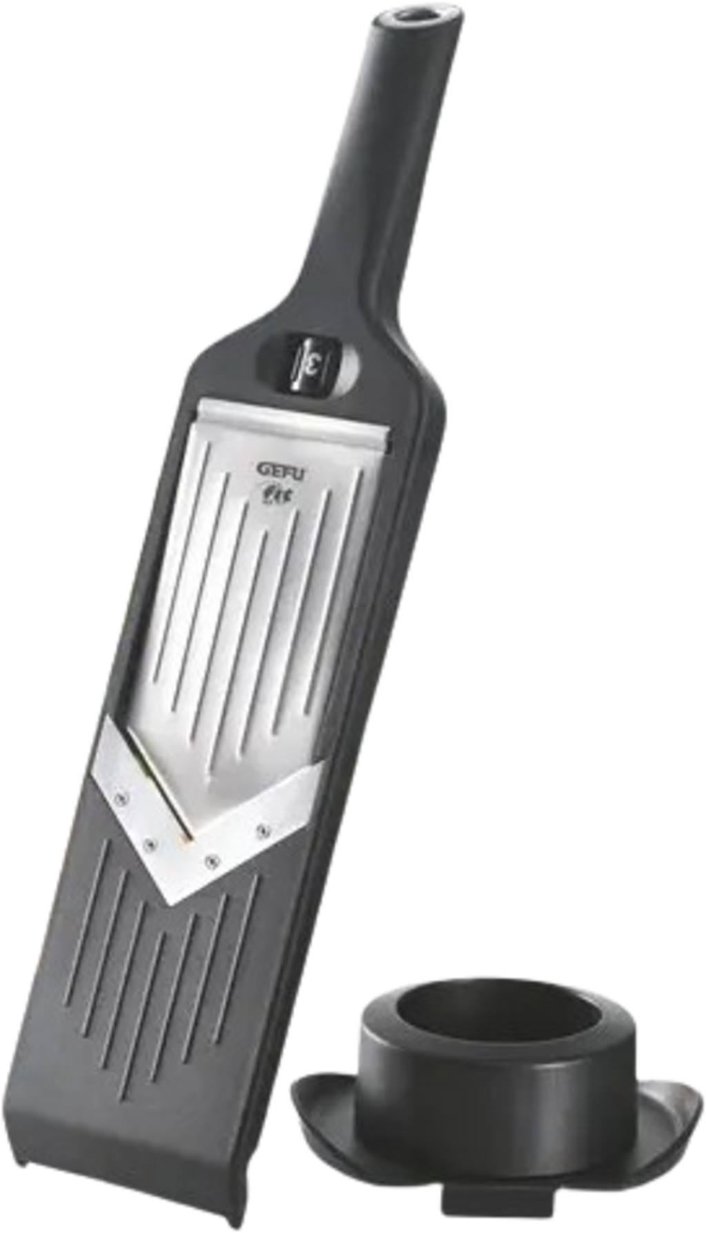 Dzięki antypoślizgowym silikonowym nóżkom urządzenie jest zawsze stabilne, a dołączony uchwyt na skrawki chroni palce podczas pracy. Gdy nie jest używana, sprytne ustawienie bezpieczeństwa zapewnia przechowywanie bez obrażeń. Dzięki zintegrowanemu oczku ze stali nierdzewnej krajalnicę można schludnie przechowywać na poręczy kuchennej.
