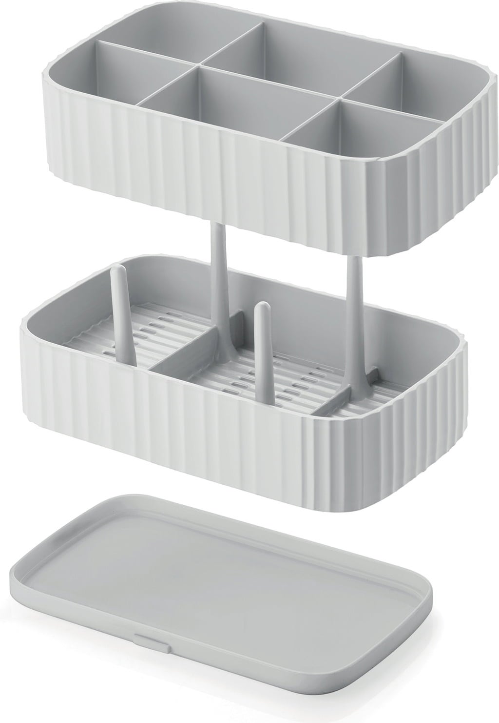 Zintegrowana płyta na dnie ociekacza jest szczególnie praktyczna. Niezawodnie wyłapuje kapiącą wodę, dzięki czemu powierzchnia robocza pozostaje czysta i sucha. A ponieważ higiena jest szczególnie ważna w kuchni, ten ociekacz na sztućce jest wykonany z antybakteryjnego tworzywa sztucznego. Kolejny plus dla środowiska: jest wykonany w 100% z recyklingu poużytkowego około 2,3 jednorazowych butelek.