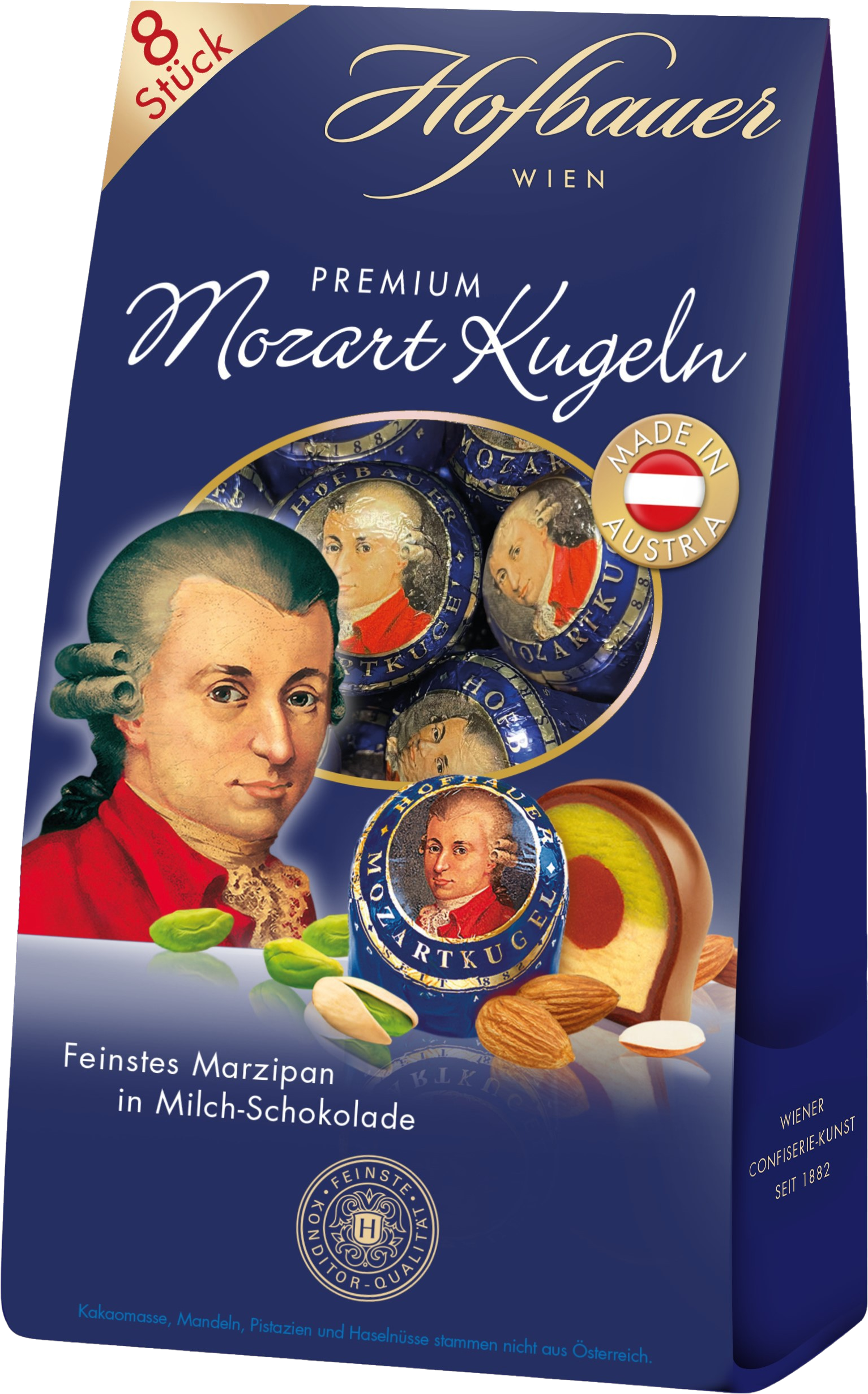 Zanurz się w wiedeńskiej tradycji cukierniczej z Hofbauer Mozartkugeln w mlecznej czekoladzie. Ekskluzywne praliny łączą w sobie trzy luksusowe warstwy: środek z delikatnego marcepanu, następnie marcepan pistacjowy i kremowe, nugatowe nadzienie z orzechów laskowych. Wszystko to oblane jest rozpływającą się w ustach mleczną czekoladą, dzięki czemu każda kulka to prawdziwa symfonia smaku.
