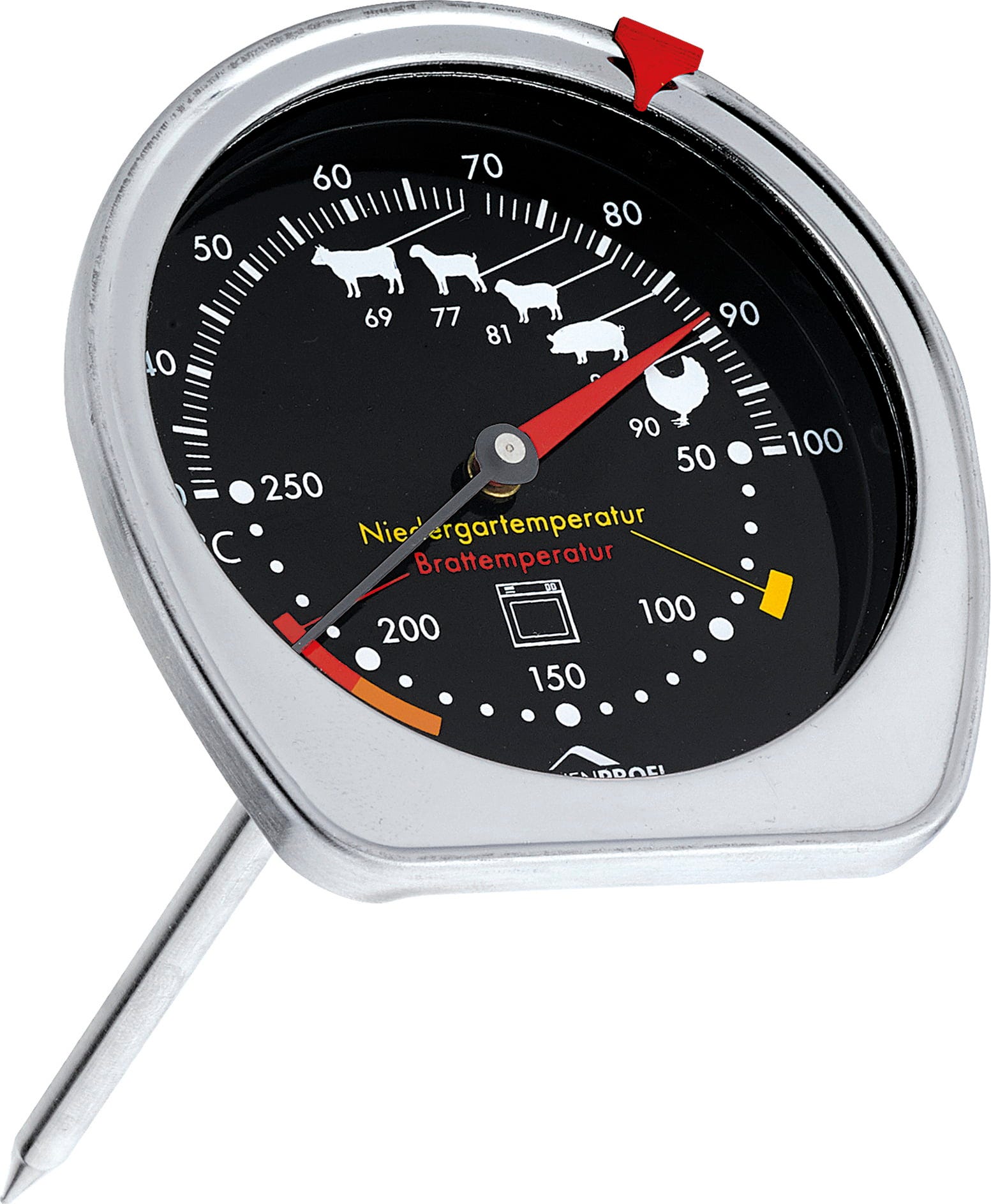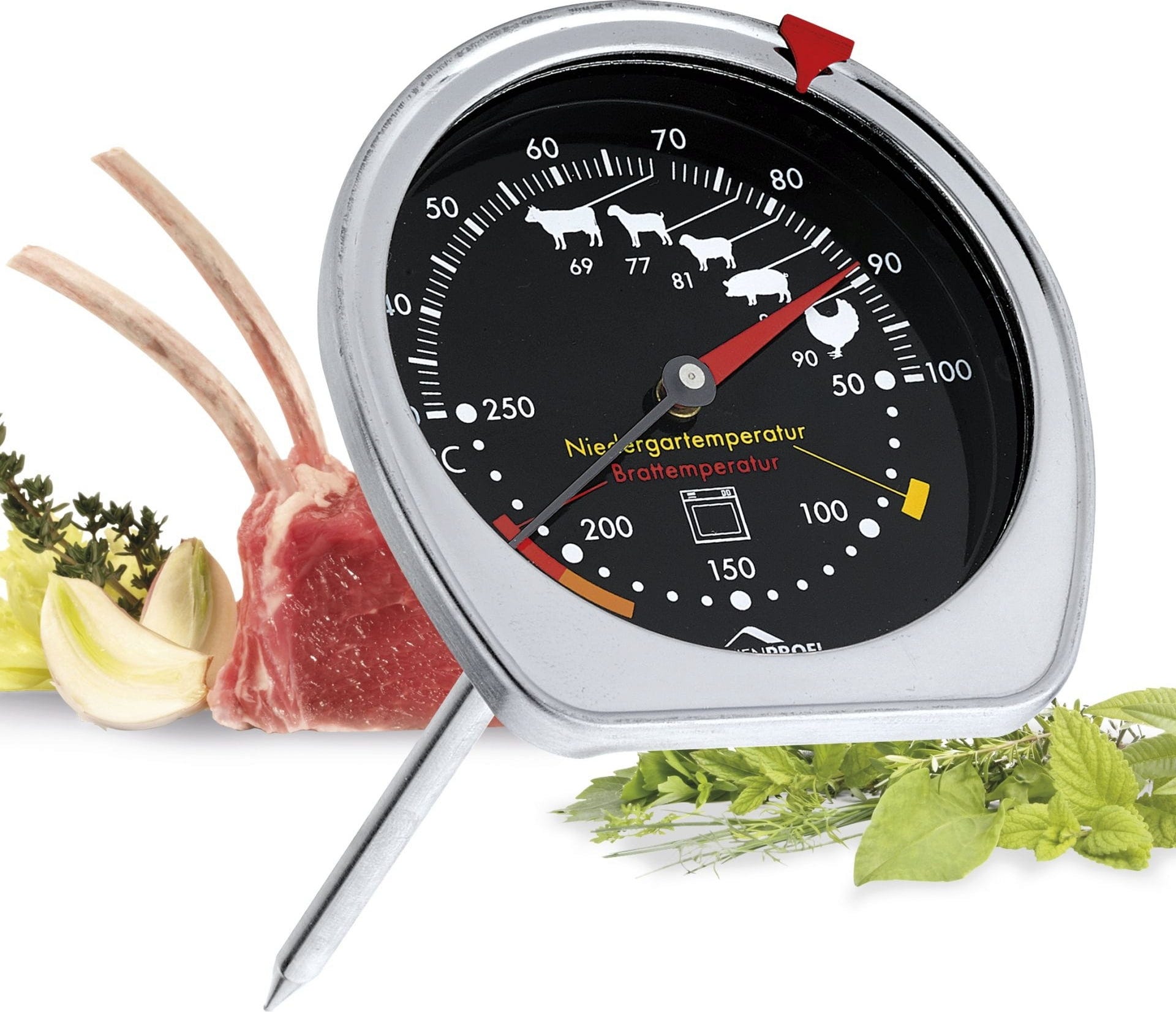 Ten praktyczny, wszechstronny termometr łączy w sobie termometr do pieczenia i piekarnika w jednym produkcie. Dwie oddzielne skale i dodatkowe symbole ułatwiają odczyt.