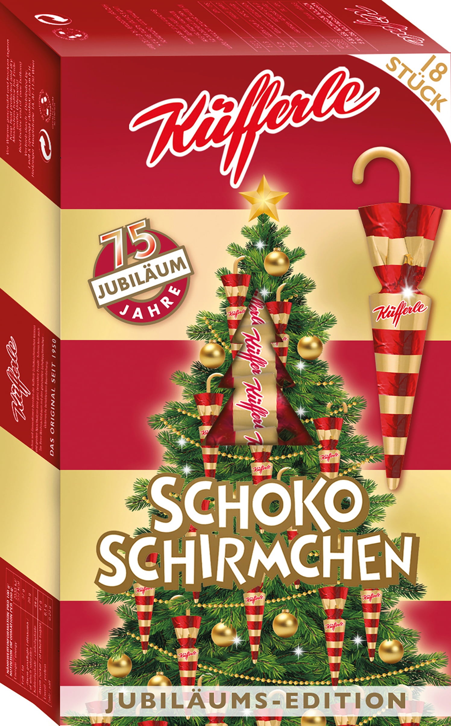 Świętuj 75 lat czekoladowych parasoli z Küfferle i daj się oczarować ekskluzywnej edycji jubileuszowej. Popularne czekoladowe parasolki są dostępne w klasycznym wzorze w paski, ale teraz w jaskrawej czerwieni i eleganckim złocie - idealne, aby nadać choince coś ekstra. Czy to jako słodka niespodzianka, czy jako nostalgiczna dekoracja: te małe klasyki wnoszą blask, radość i uśmiech do świąt Bożego Narodzenia.