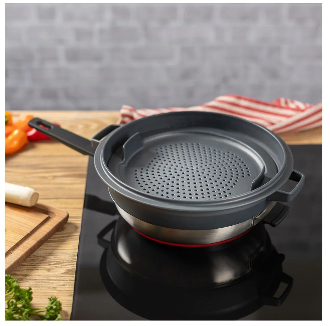 Podobnie jak wszystkie elementy z serii SMART & COMPACT firmy Kuhn Rikon, ten sprytny pomocnik kuchenny imponuje pomysłową konstrukcją 2 w 1. Może być używany zarówno jako wygodny ociekacz, jak i praktyczna osłona przed rozpryskiwaniem podczas gotowania. Często nieporęczne sitko do odcedzania makaronu, ziemniaków itp. nie jest już potrzebne.