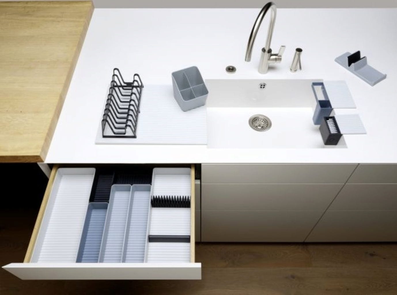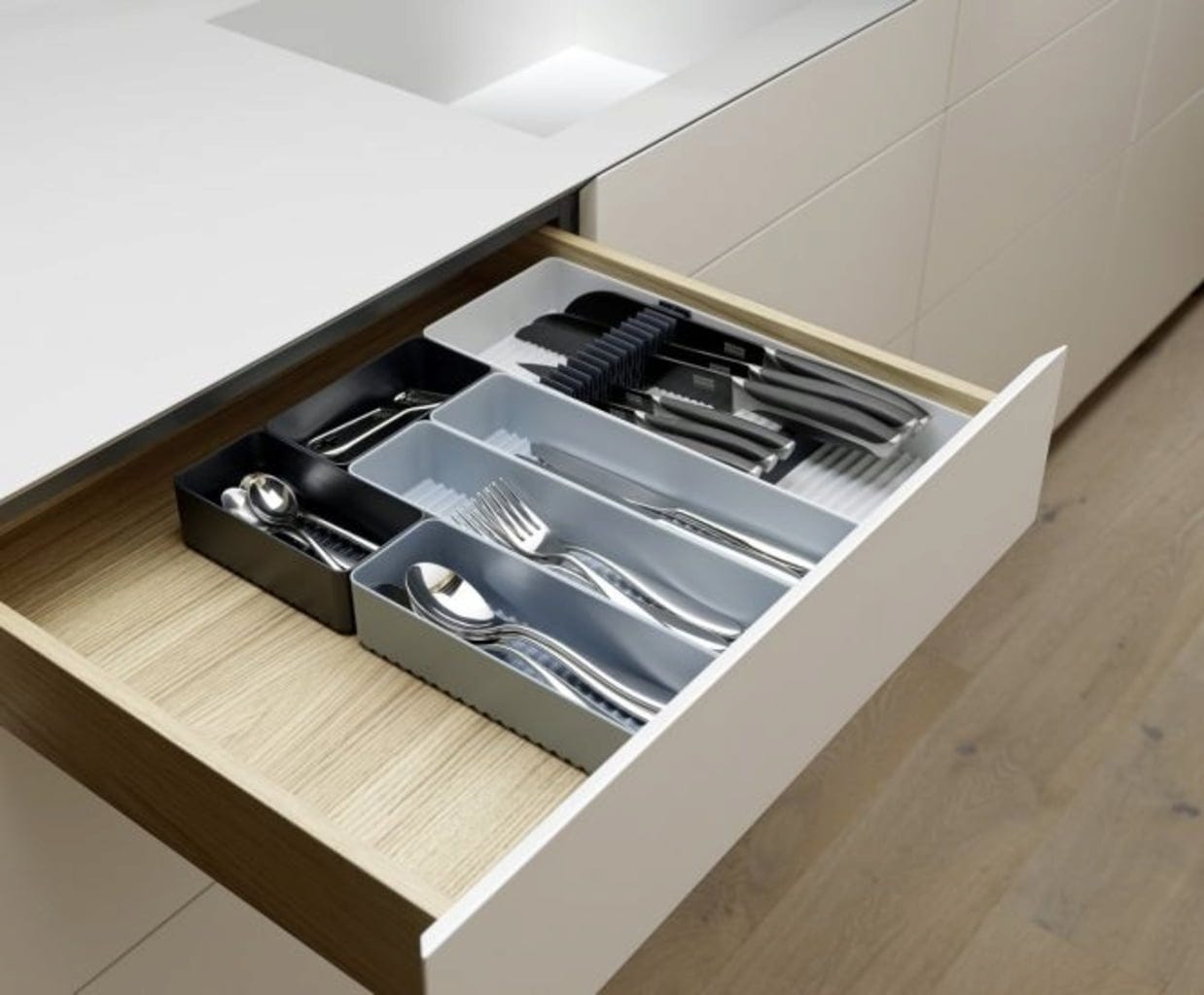 Dobrze zaprojektowane i przejrzyście zorganizowane wkłady do szuflad są idealne do szybkiego znajdowania przyborów kuchennych. Umożliwiają one precyzyjne łączenie poszczególnych modułów, a przybory kuchenne można łatwo wyjąć dzięki karbowanej podstawie.