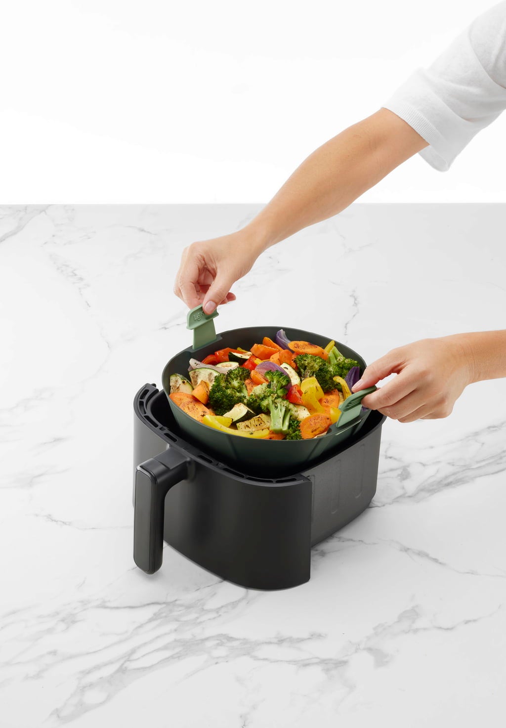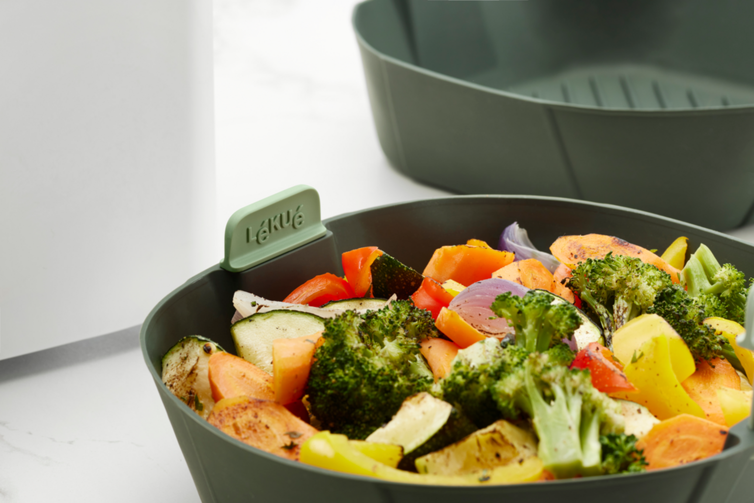 Kosz do frytownicy beztłuszczowej, Air Fryer od Lékué to praktyczny partner, który podniesie Twoje dania z tego urządzenia na nowy poziom. Jego sekret tkwi w elastycznej konstrukcji z elastycznymi narożnikami, która idealnie dopasowuje się do różnych rozmiarów i kształtów frytownic (idealny do urządzeń o pojemności od 5 l do 6,5 l), a tym samym optymalnie wykorzystuje przestrzeń do gotowania. Wysuwane, nieprzywierające uchwyty są szczególnie praktyczne i dobrze przemyślane: można je podnieść lub opuścić, aby uzyskać większą odległość od ciepła i bezpieczniejsze wyjmowanie.