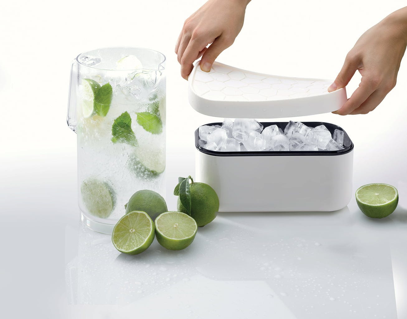 Sam pojemnik jest wykonany z wytrzymałego tworzywa ABS i spoczywa na praktycznie podniesionej podstawie. Ta konstrukcja pomaga dłużej utrzymać chłód w środku, a także skutecznie zapobiega tworzeniu się nieestetycznych skroplin. Elastyczna pokrywa wykonana z wytrzymałego silikonu nie tylko bezpiecznie zamyka pojemnik i utrzymuje świeżość kostek lodu, ale także służy jako praktyczna foremka do kostek lodu!