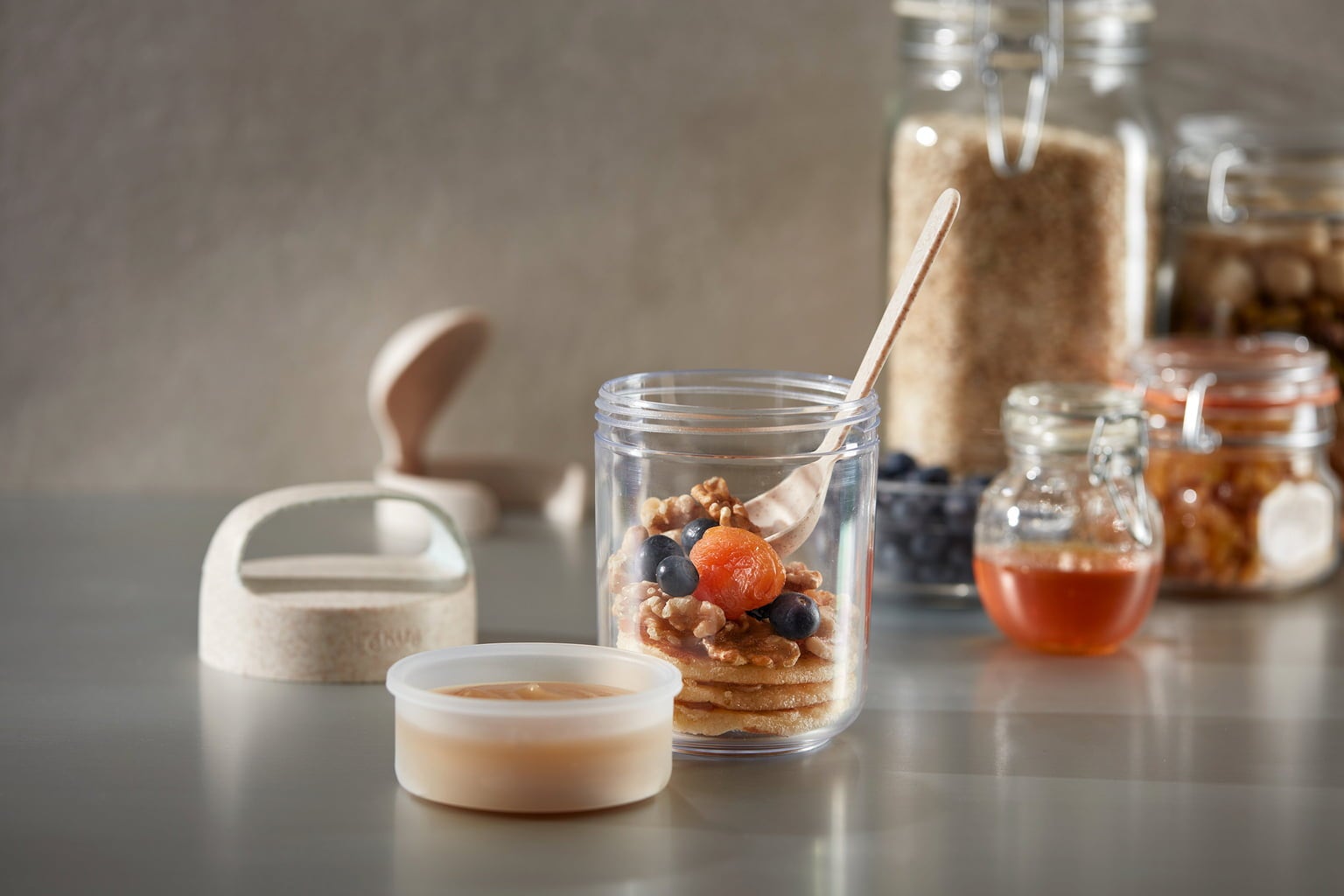 Kubek jest w 100% hermetyczny i całkowicie szczelny, dzięki czemu można go bez obaw nosić w torbie lub plecaku. Praktycznie zaprojektowana łyżeczka z własną higieniczną osłoną jest zawsze na miejscu dzięki bezpiecznemu klipsowi. Jej lekko pochylony kształt jest idealny do łatwego wyjmowania posiłku z pojemnika. Prawdziwą atrakcją jest jednak składany silikonowy pojemnik wewnętrzny: można dostosować jego wysokość do wielkości porcji lub użyć go do przechowywania różnych składników oddzielnie - idealny do mieszania chrupiących dodatków do jogurtu lub dressingów do sałatek tuż przed jedzeniem.