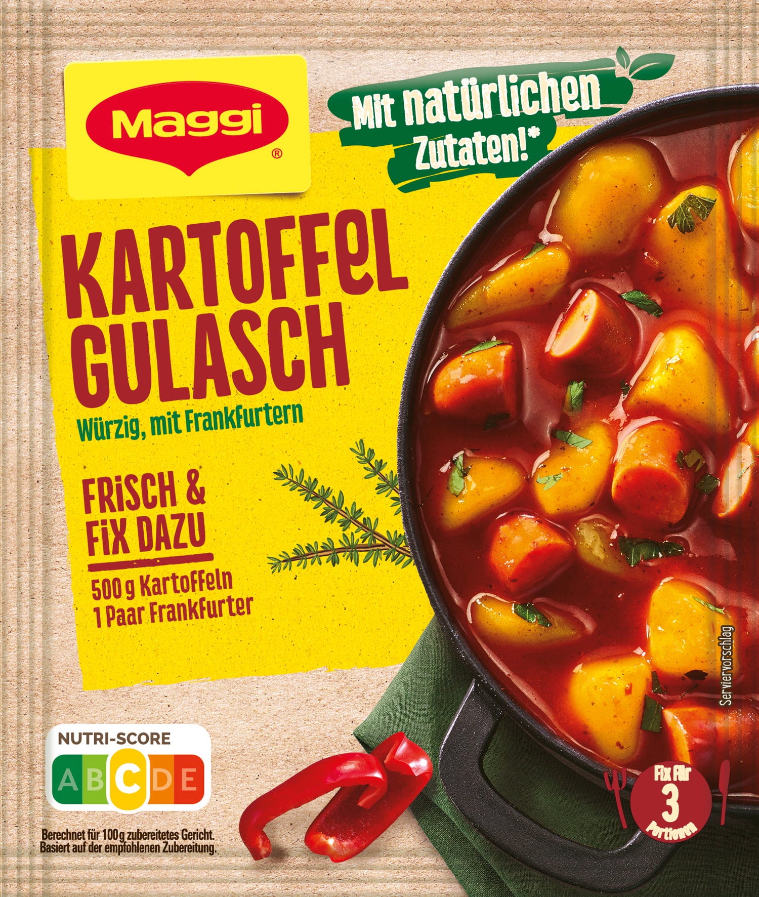Gulasz ziemniaczany smakuje zarówno młodszym, jak i starszym. Dzięki mieszance przypraw Maggi do gulaszu ziemniaczanego, ten klasyk z ziemniakami i kiełbasą w pikantnym sosie gulaszowym jest gwarantowany - szybki i łatwy w przygotowaniu.