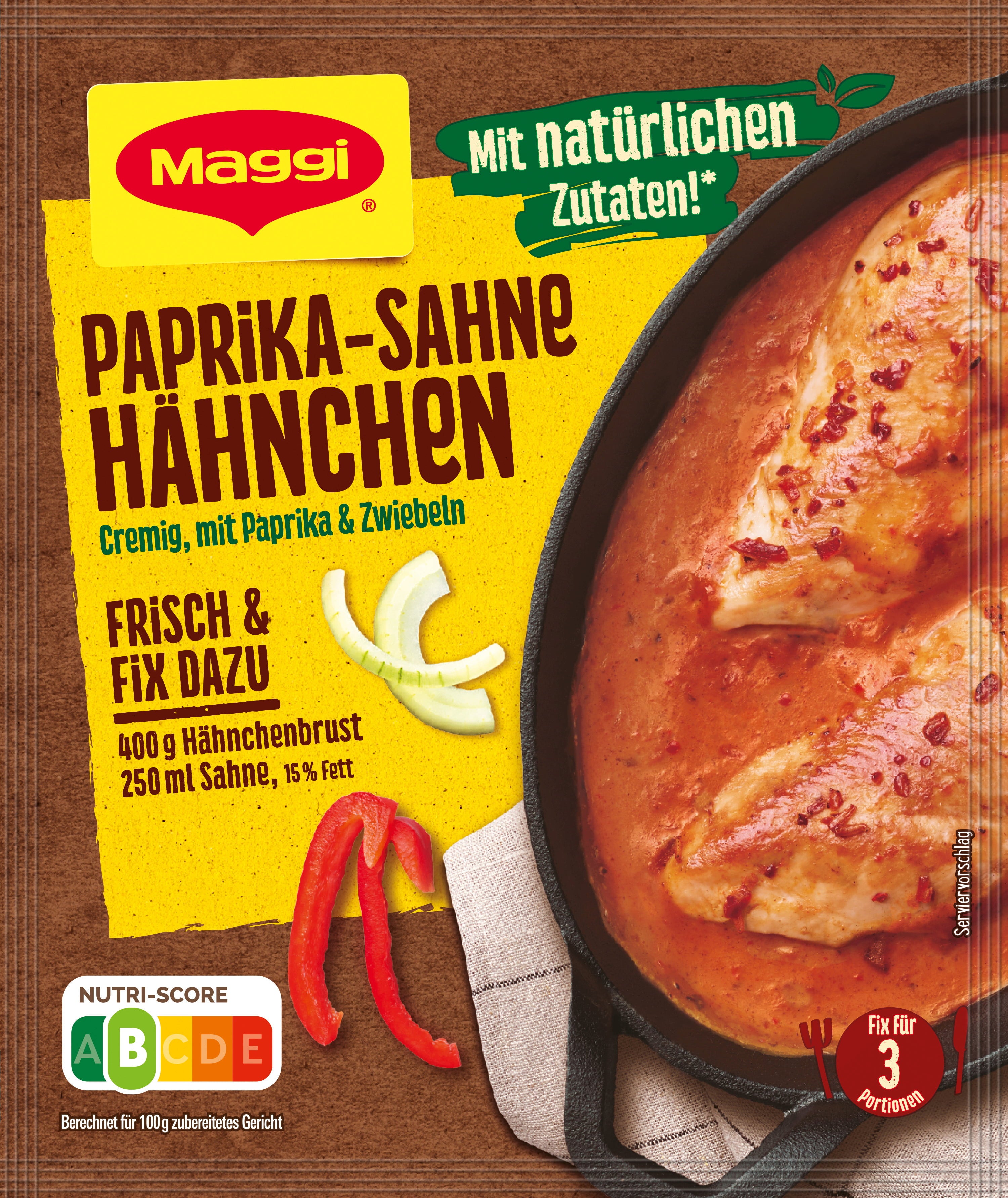 Dzięki mieszance przypraw Maggi do kurczaka w śmietanie z papryką, możesz przygotować pyszne danie z piekarnika w mgnieniu oka i bez zbędnego zamieszania. Połączenie aromatycznych przypraw, cebuli i wędzonego boczku tworzy harmonijny sos, który doskonale komponuje się z kurczakiem. Idealny na obfity obiad lub kolację dla całej rodziny. Szybkie i łatwe w przygotowaniu - na pyszny posiłek.