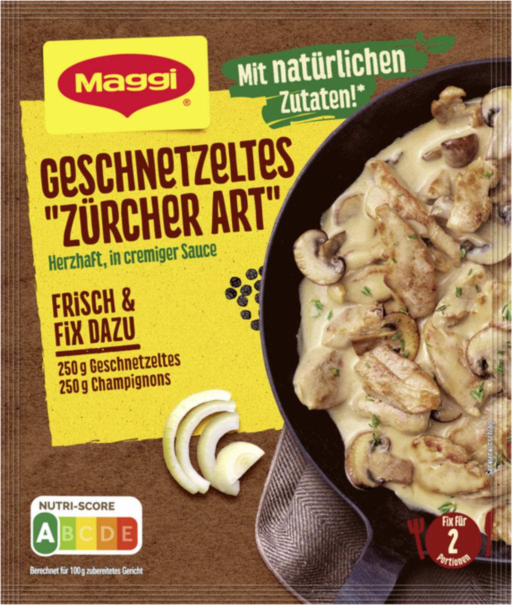 Podsmażyć 250 g pokrojonego mięsa. Następnie dodać 250 g pieczarek i mieszankę przypraw Maggi i krótko dusić - a na stole pojawi się klasyczny Zürcher Geschnetzeltes, który pokocha cała rodzina.