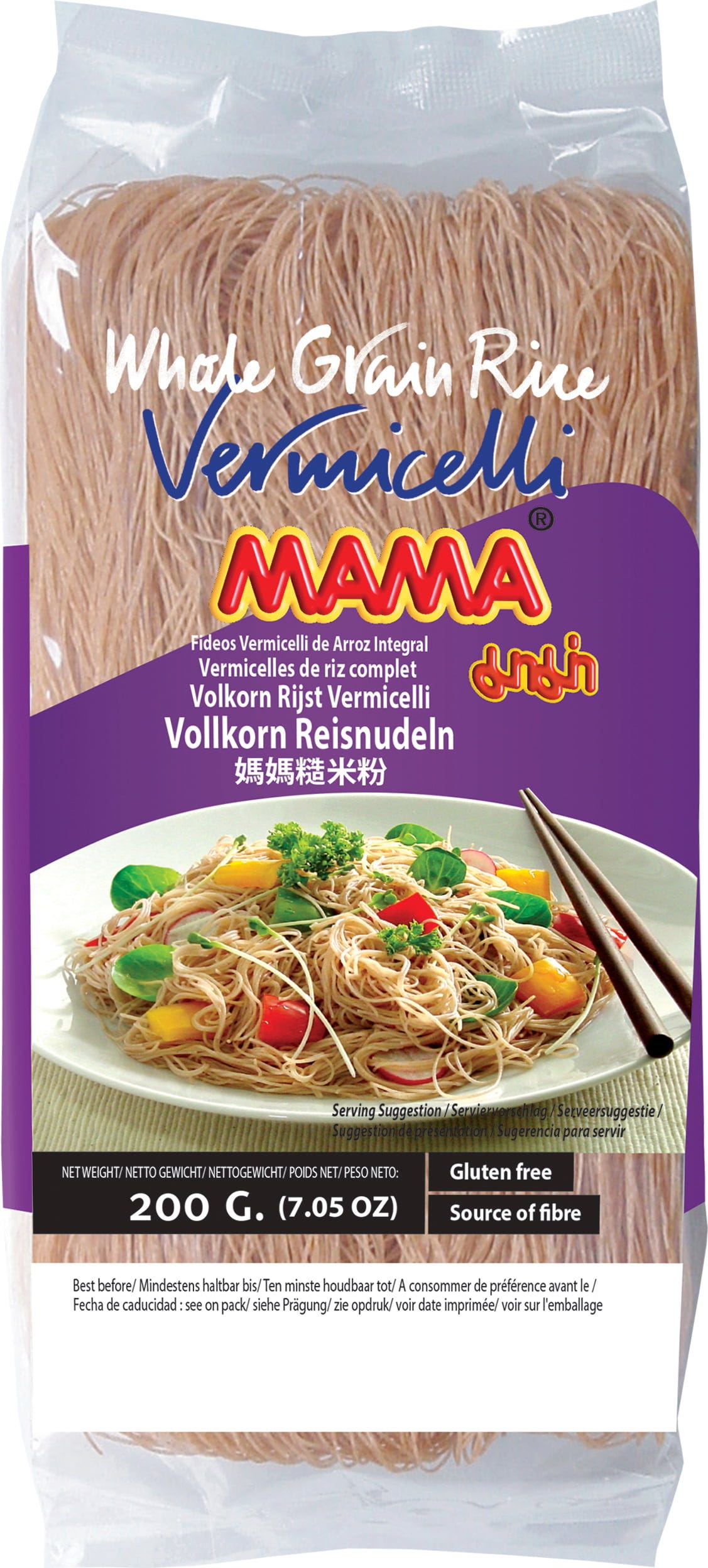 Pełnoziarnisty makaron ryżowy MAMA składa się z dużej ilości pełnoziarnistego ryżu i zachwyca przyjemnie orzechową konsystencją i naturalnym smakiem. Jest uniwersalny - zarówno w zupach, daniach z woka, jak i sałatkach - i można go przygotować w zaledwie kilka minut.