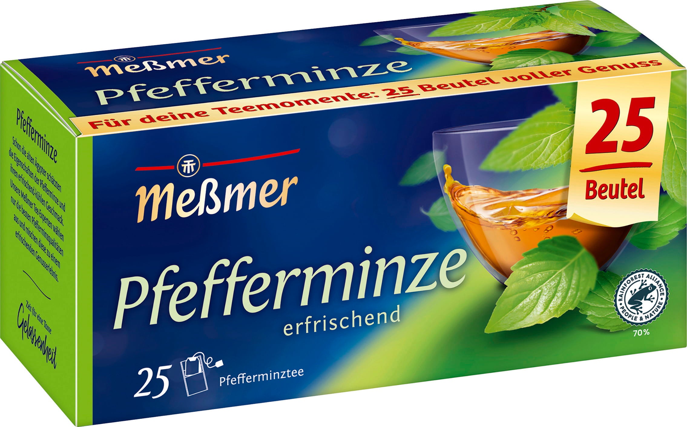 Odkryj czystą świeżość: Herbata miętowa Meßmer przekonuje wyselekcjonowanymi liśćmi mięty pieprzowej, które zapewniają przyjemnie chłodny smak w każdym naparze - idealny do filiżanki herbaty w międzyczasie.