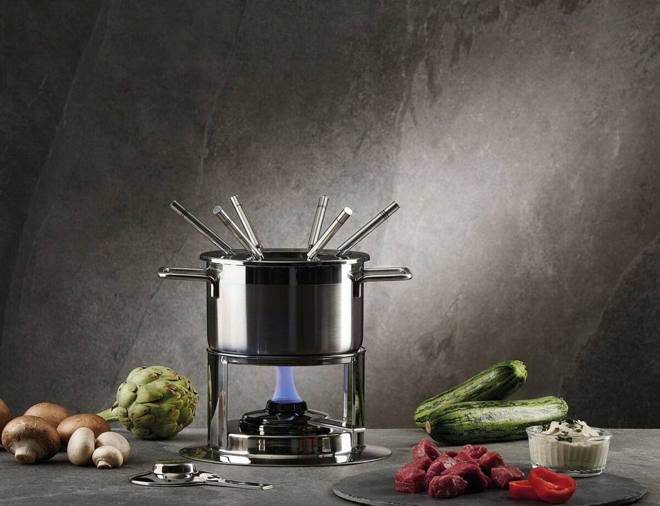Ser, tłuszcz, bulion czy czekolada? Niezależnie od tego, jakie fondue preferujesz, z tym zestawem wspólna uczta może odbyć się w każdej chwili. Garnek wykonany z wysokiej jakości stali nierdzewnej można podgrzewać na wszystkich popularnych rodzajach kuchenek. Ponadto nadaje się on do użytku w piekarniku oraz mycia w zmywarce. Sześć widelczyków posiada indywidualne oznaczenia, aby nikt nie stracił z oczu swoich przysmaków.
