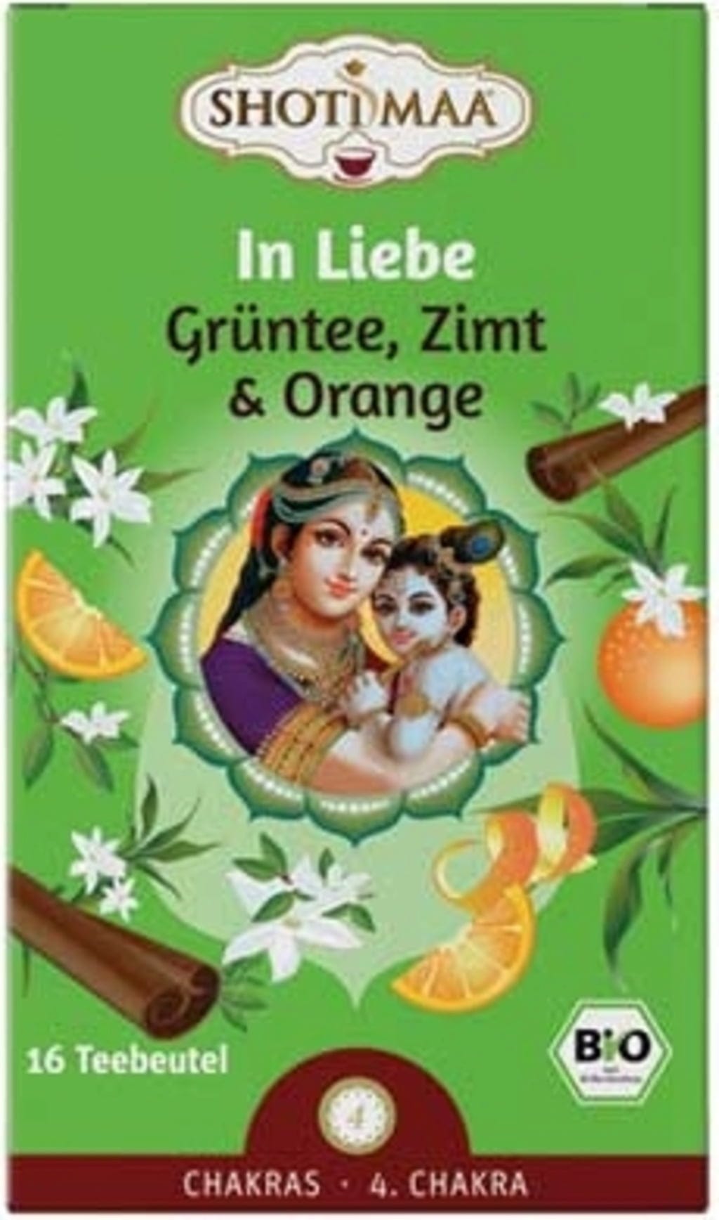 Shoti Maa Bio herbata - Loving (4. czakra) - zielona herbata, cynamon i pomarańcza, 16 torebek herbaty (32 g)