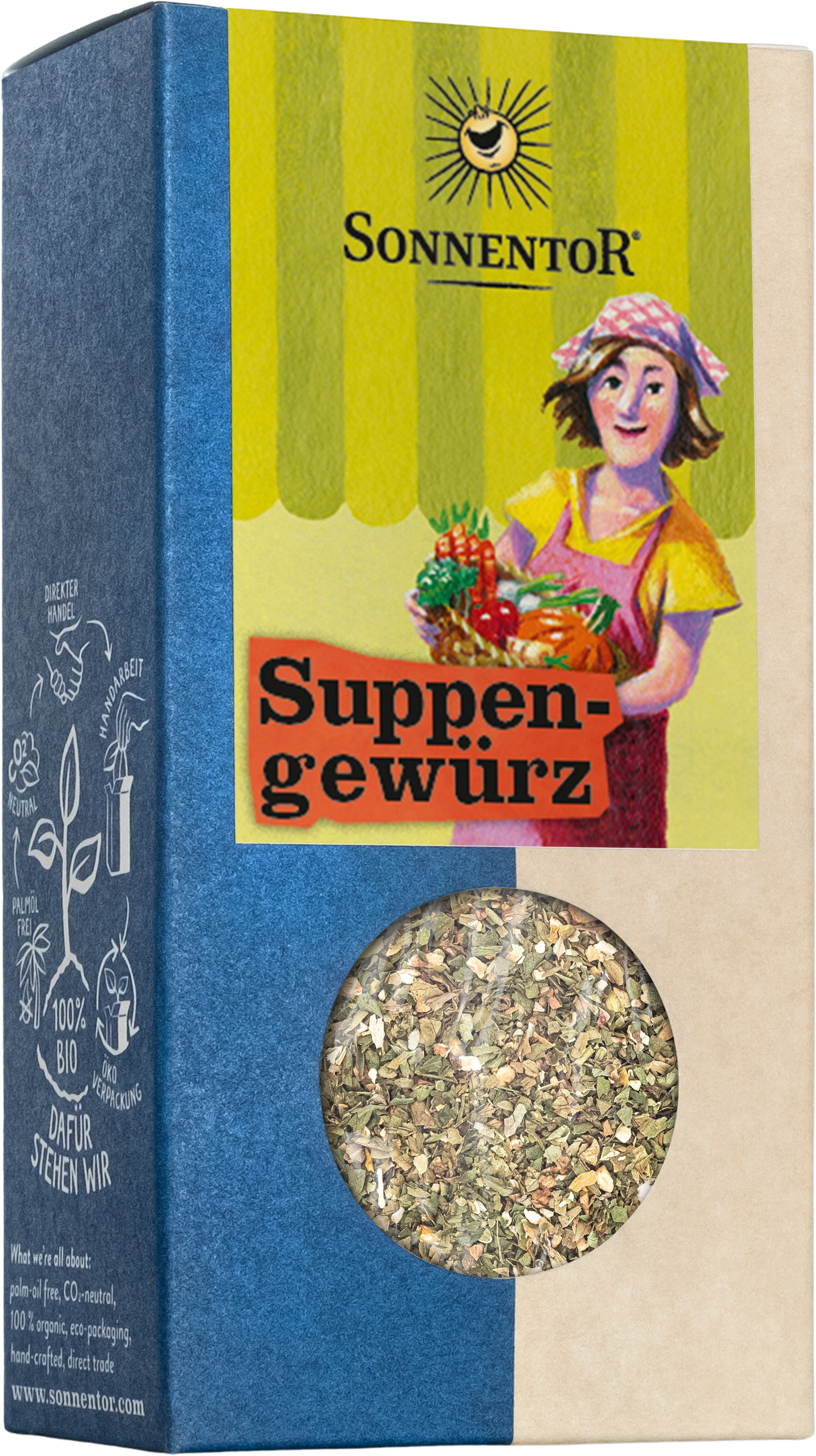 Przyprawa do zupy daje gorącym, pysznym zupom i potrawom delikatny smak aromatycznych ziół. Przyprawa do zup firmy Sonnentor nadaje aromat, który oczekuje się od pysznej i smacznej zupy. Wskazówka: przyprawę najlepiej dodać już na samym początku gotowania, aby jej aromat mógł przeniknąć do wszystkich składników.