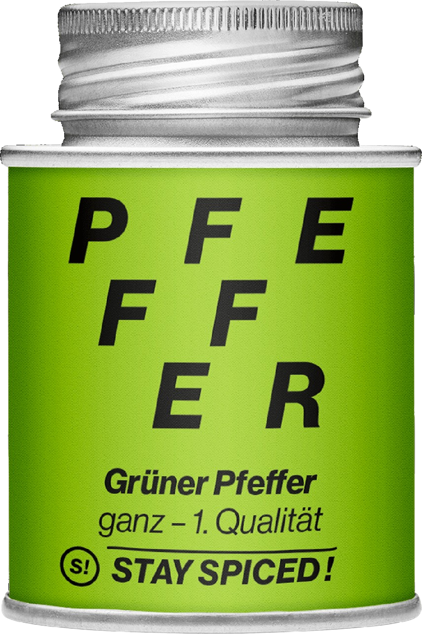 Ziarna zielonego pieprzu "Malabar - 1. jakość" od Stay Spiced! nadają się szczególnie do przygotowania klasycznego sosu pieprzowego. Ci, którzy cenią słodki i pikantny kontrast, mogą również cieszyć się zielonym pieprzem jako składnikiem owocowych deserów.