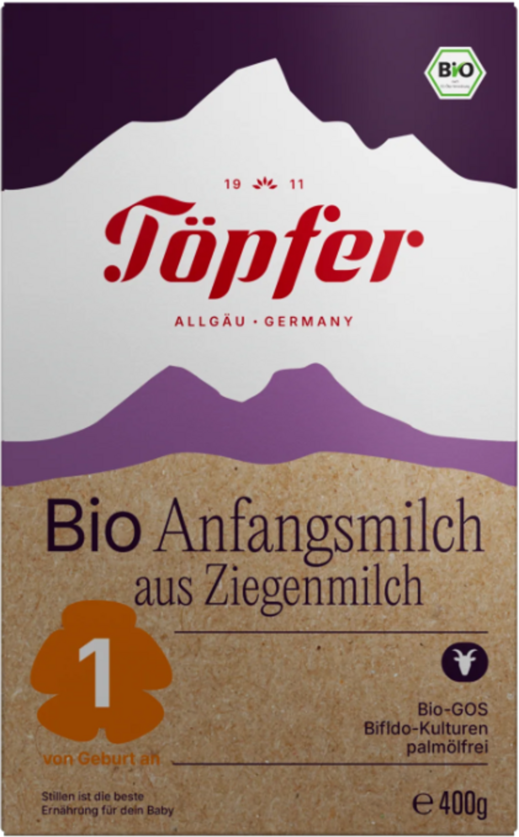 Töpfer Bio oferuje Bio PRE preparat do początkowego żywienia niemowląt na bazie mleka koziego 1, który towarzyszy noworodkom od pierwszego dnia życia. Może być stosowany jako wyłączne źródło pożywienia, gdy nie karmisz piersią, dodatkowo do mleka matki lub po zakończeniu karmienia piersią jako posiłek mleczny.