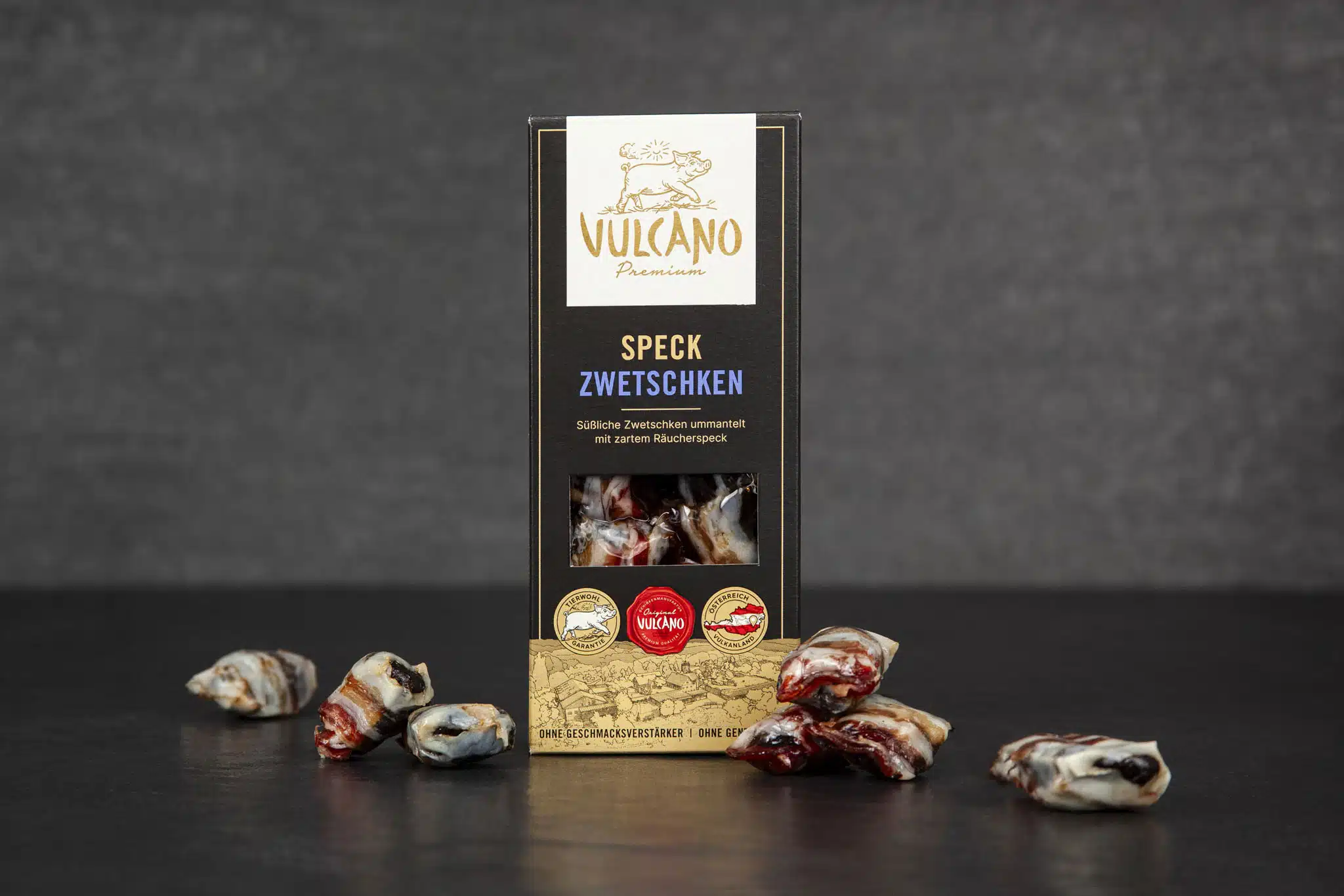 Suszone śliwki zostały owinięte delikatnym, lekko wędzonym boczkiem. Te owoce z mięsem idealnie nadają się jako mała przekąska. Smakują również jako podsmażony dodatek do sałatek, chutney lub same jako przekąska. Wyśmienite uzupełnienie również podczas przerwy.