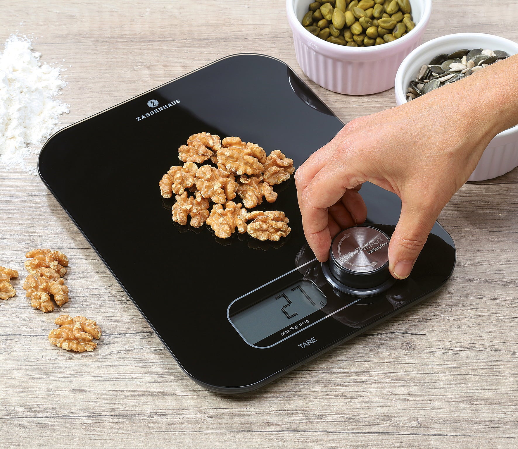Waga cyfrowa Zassenhaus Eco Energy zapewnia maksymalną dokładność w kuchni - bez baterii! Po prostu zasilana przez dynamo, odmierza do 5 kg w odstępach co 1 g. Praktyczna, solidna i trwała - sprytny pomocnik kuchenny, który niezawodnie wspiera podczas pieczenia i gotowania.